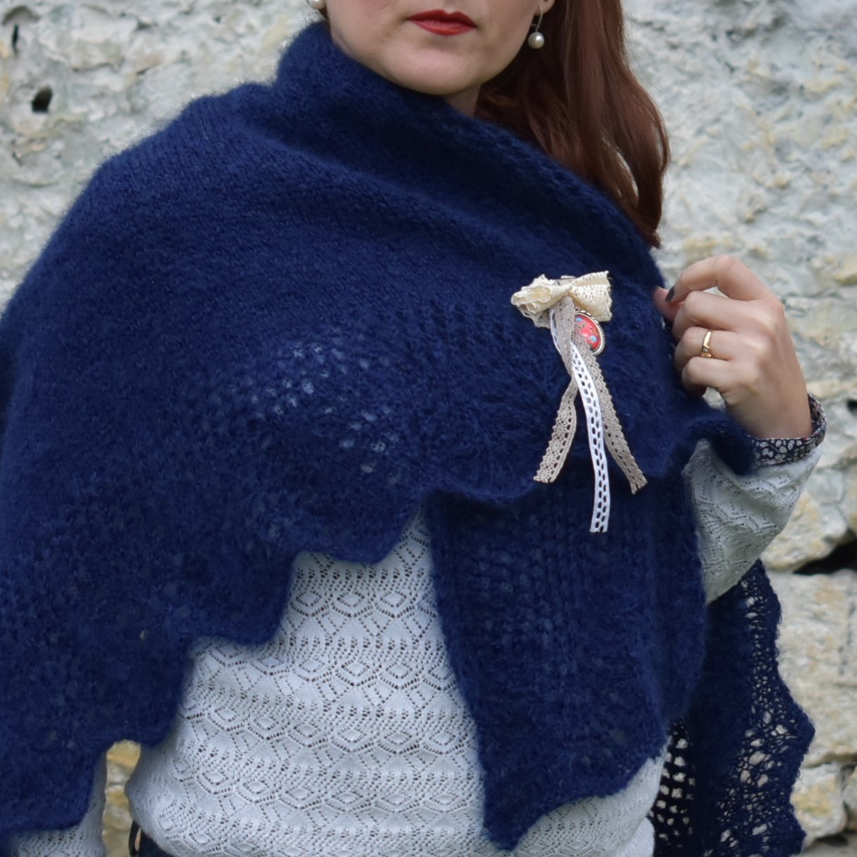 Un châle, ce rectangle (un peu comme une étole) imaginé avec dentelle et jersey, celui-là même dont j’avais rêvé. Telle une petite couverture, il se pose sur les épaules ou s’enroule autour du cou. Il aime vous attendre sur le bras de votre fauteuil préféré, ou réchauffer vos jambes pendant votre pause thé!