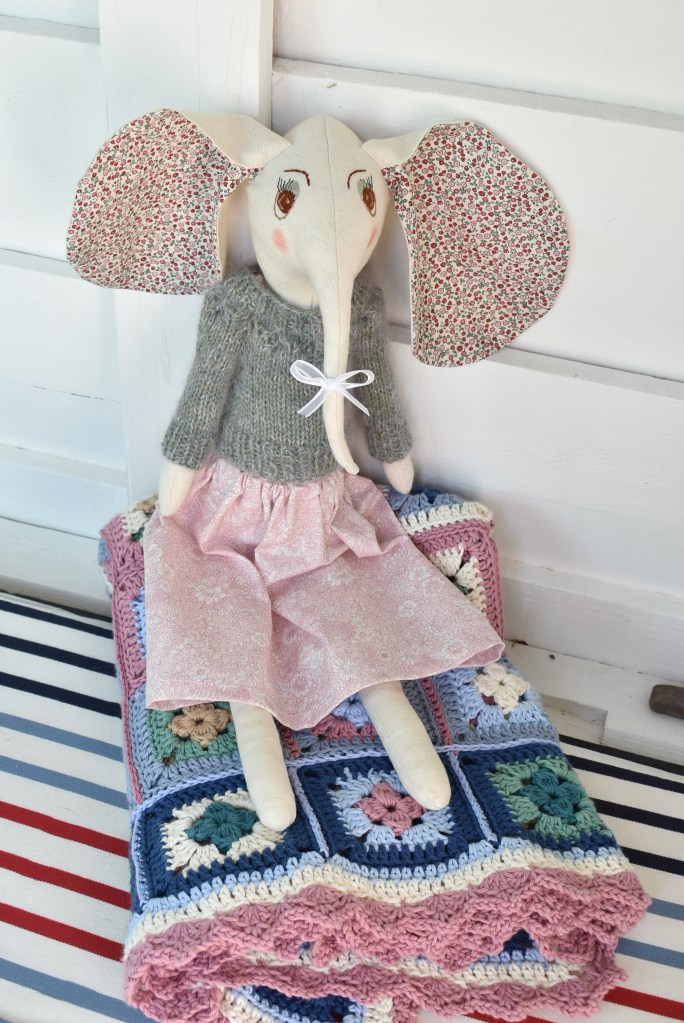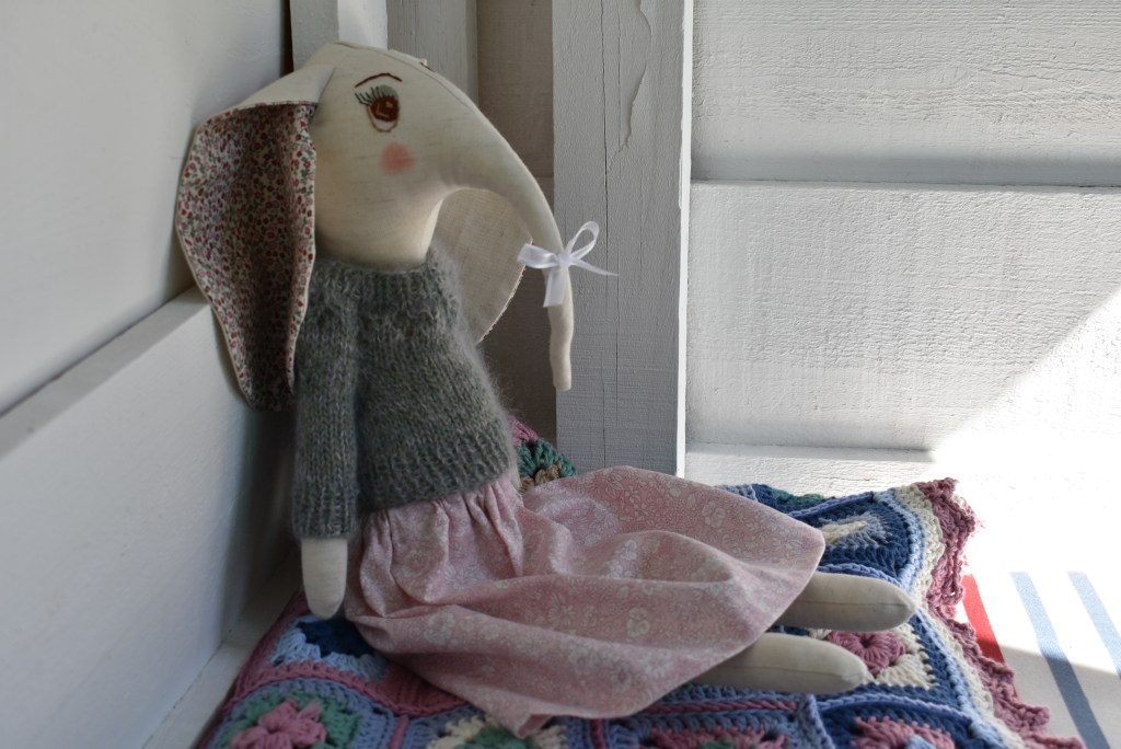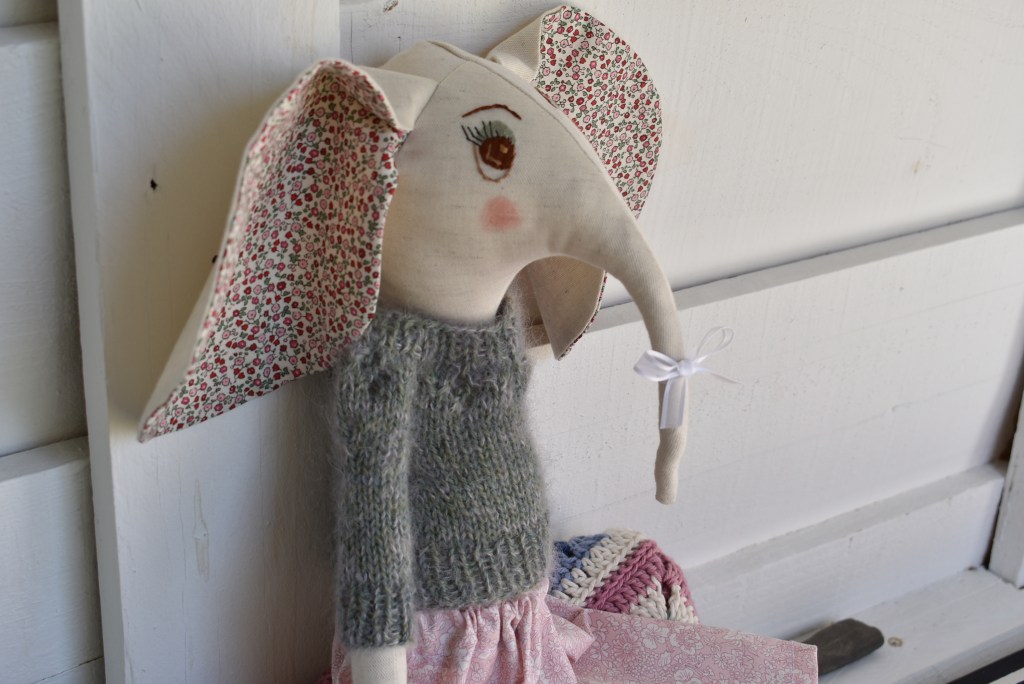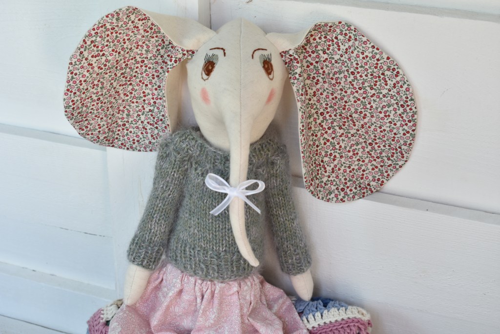 Une poupée éléphant élégante, à coudre en Lin et coton fleuri, avec un patron en pas à pas en photos et par écrit.