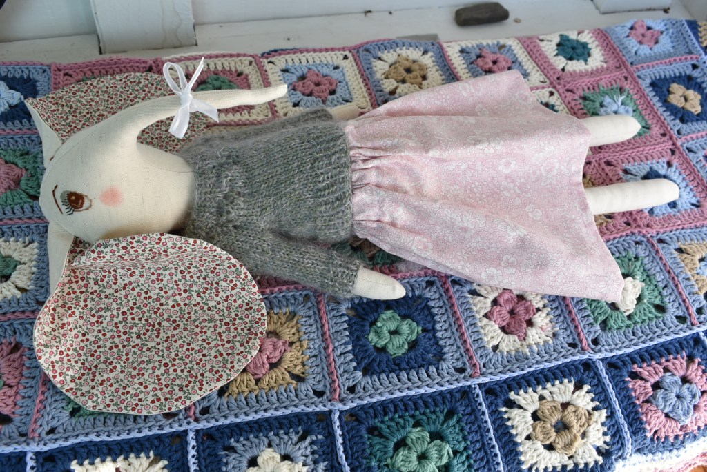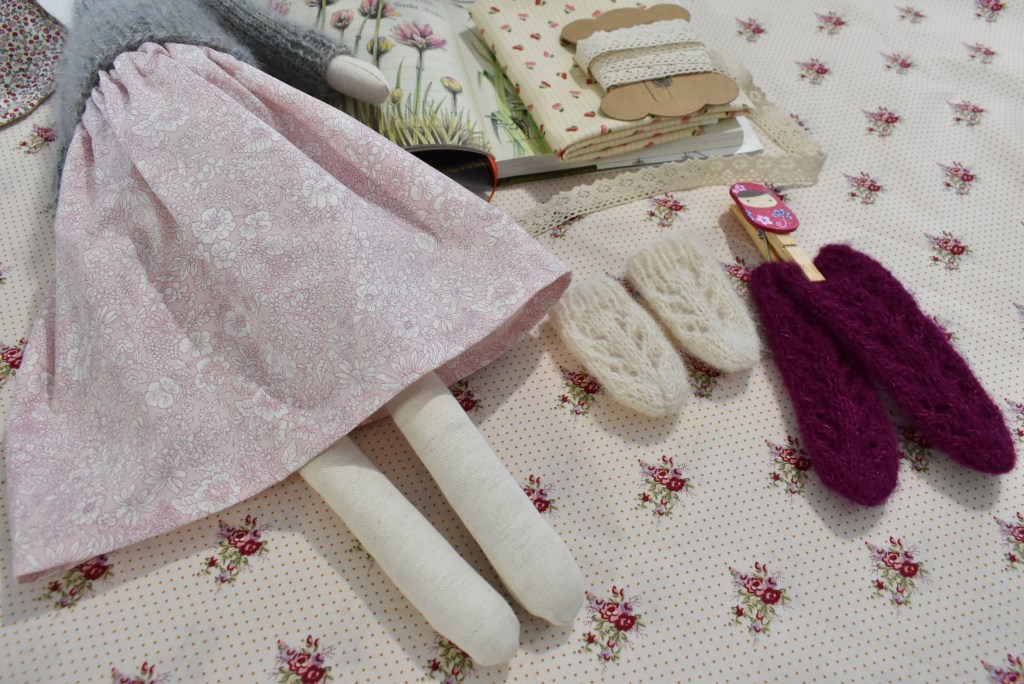 Pour la circonstance, Sally a enfilé sa longue jupe en coton Liberty, un rose pâle et des fleurs crèmes toutes légères, un pull alpaga et mohair pour le côté léger lui aussi, un point de dentelle discret suit l’arrondi du Yoke (arrondi du haut du pull).