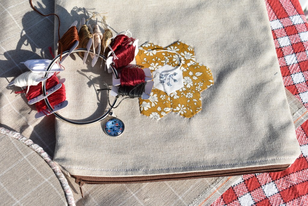 Pas de sac assez grand pour y glisser mon joli ouvrage. Il faut alors que je m’attelle à faire une pochette un peu lus grande. Reprendre mes tissus Liberty et le lin pour y coudre mon jardin de fibres.