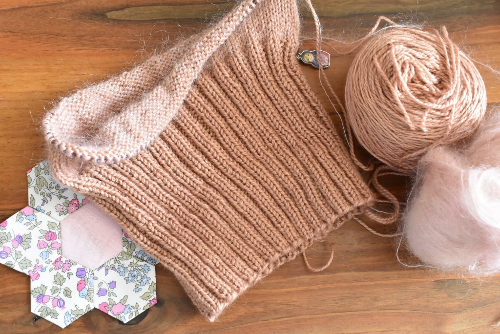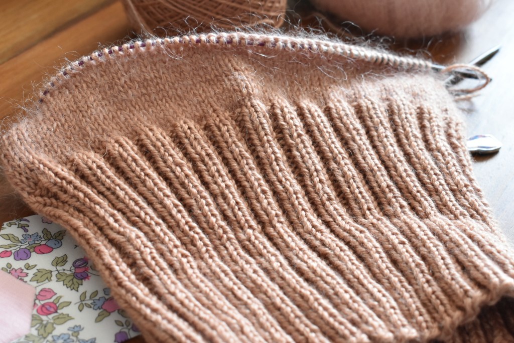 Mon simple pleasures hat avance bien. La longue période de côtes étant passée, le tricot mohair-fingering est un vrai plaisir. Du jersey en rond, d’une douceur étonnante, que déjà je pense au prochain!