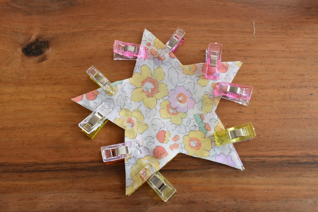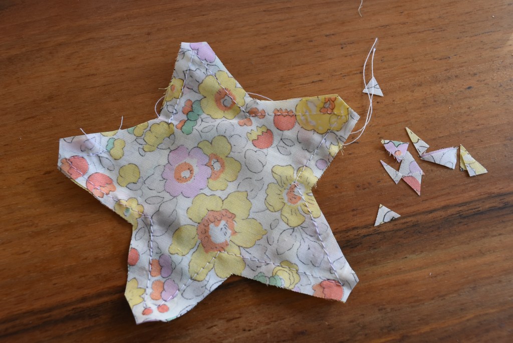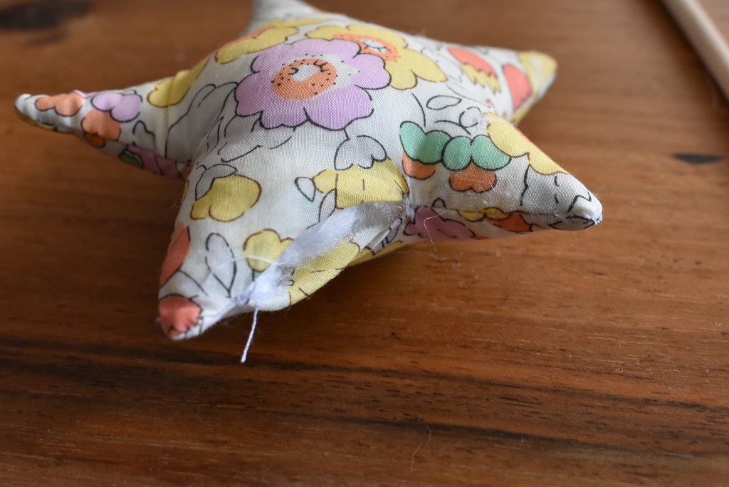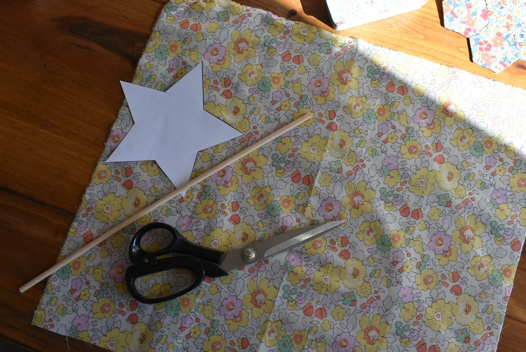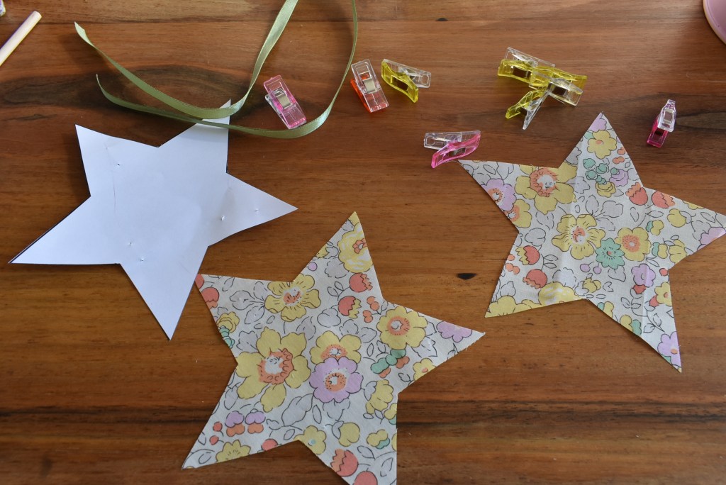Une étoile à couper dans le papier, 2 étoiles en tissus, un peu de couture, de ouate de rembourrage, une baguette (chinoise pour dépanner!) deux jolis rubans et voilà le tour est joué!