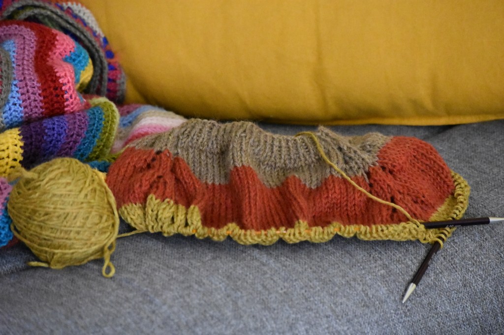 C’est donc avec les souvenirs d’enfance, l’automne en tête et la brise fraîche sur la peau que vais finir de tricoter ce pull de restes de laine.