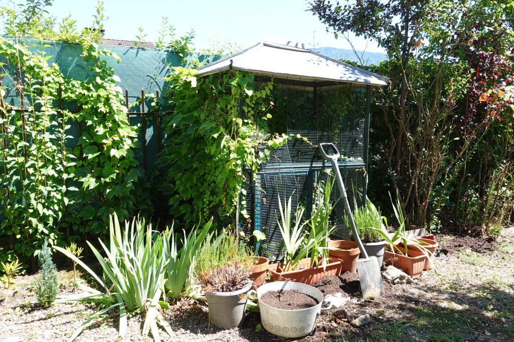 Cela m’a permis de bien arranger mon coin volière non loin de mon coin salon de thé sur la terrasse.