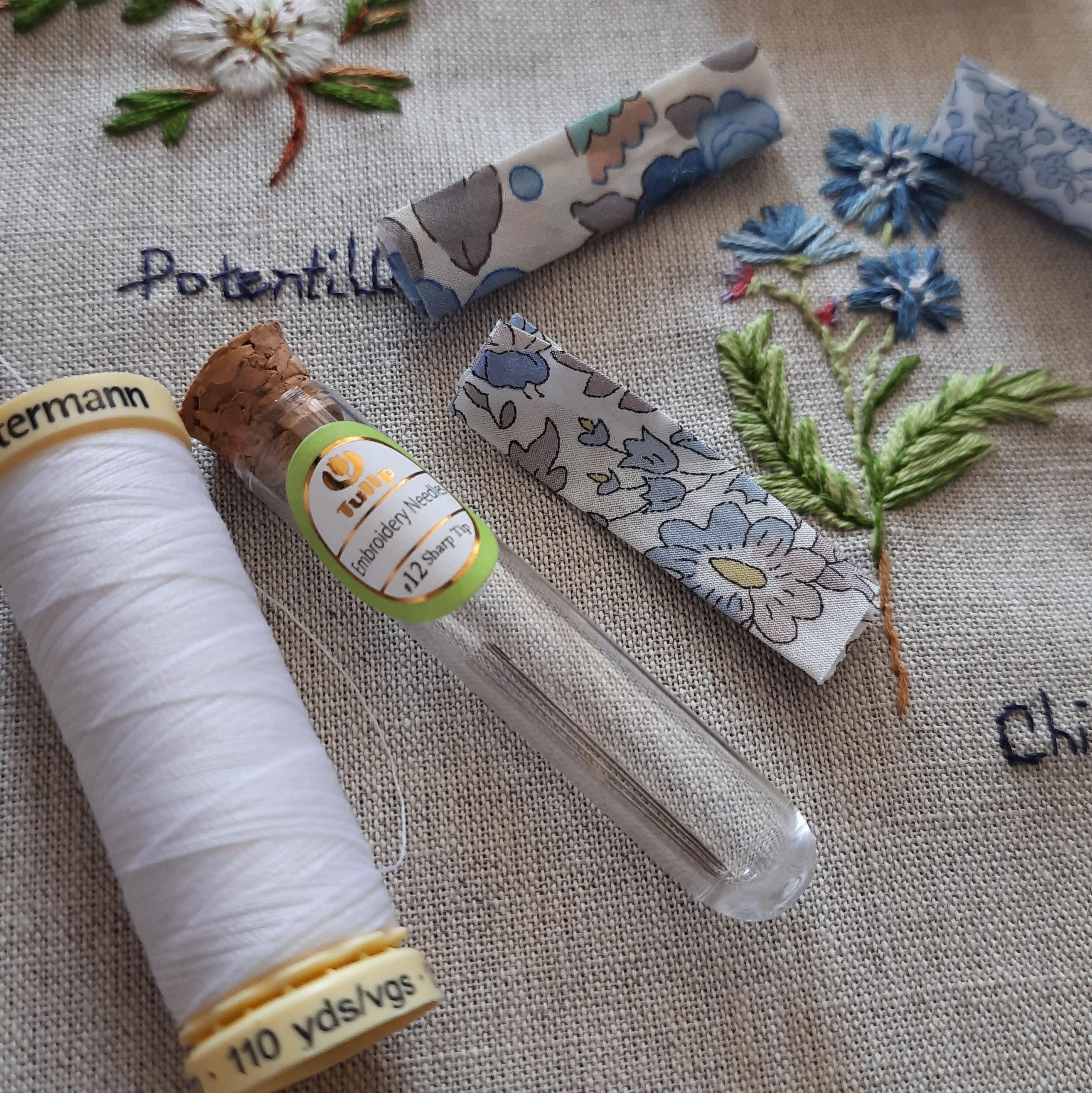 J’ai alors eu l’idée de broder un herbier blanc et bleu, et de « scotcher » les plantes comme si elles l’étaient dans un cahier. Les biais de Liberty sont de la taille idéale pour imiter les washi tapes. et c’est à petits points de couture que je les ai « collé » sur la toile de lin.