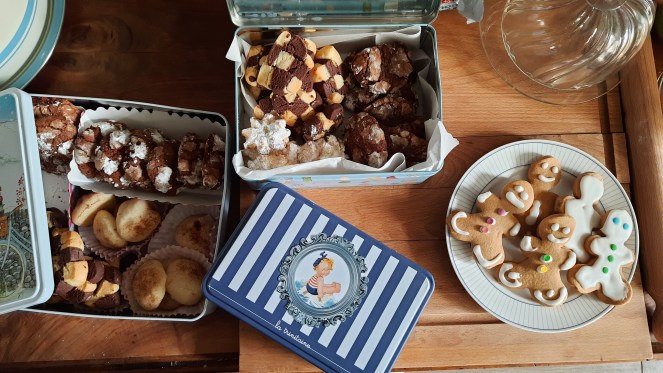 *Une journée complète à cuisiner toute sorte de pâtes sablées et chocolatées, une collection de boites en métal (jamais assez grandes pour tout contenir) et cette idée fixe de faire de jolies boites décorées parce que c’est l’hiver (et bientôt les vacances à la maison) et que c’est festif!