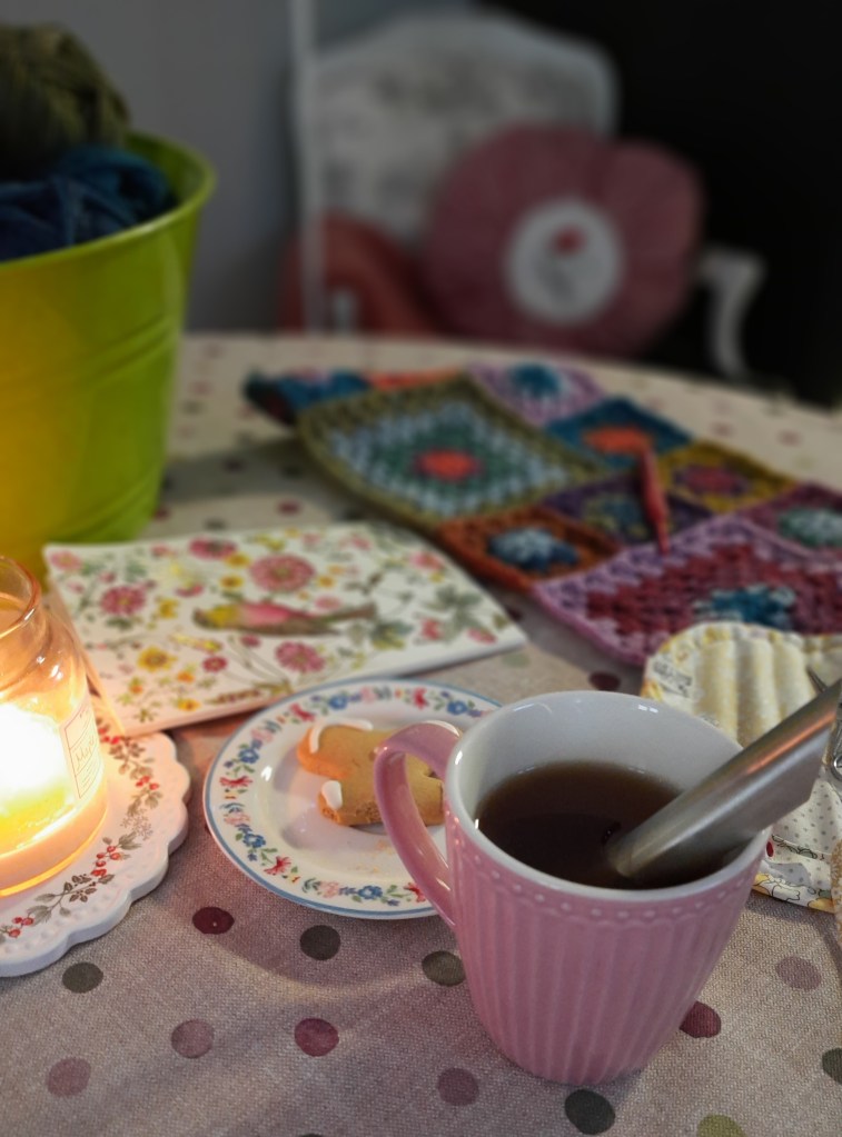 Je suis beaucoup sortie de la maison ces derniers jours; jardin mais aussi balade dans le village avec les enfants pour relever des plantes pour un devoir de science. Samedi matin, il faisait froid et le vent était glacial. Je crois qu’on apprécie d’avoir pris l’air une fois qu’on rentre. On a marché vite, on a bien rit et on a tous pensé à la boite de biscuits avec ce « je prendrai bien quelque chose de chaud ».