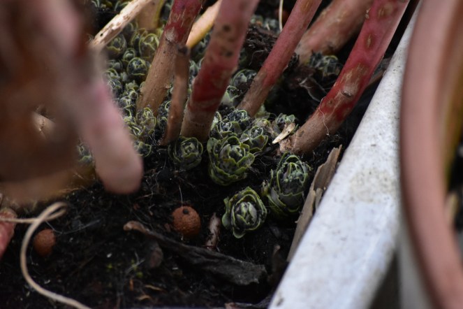 J’ai fini par balayer les miettes de graines laissées par les oiseaux au pied de la mangeoire et à déplacer des pots. J’ai vidé des sacs de terre entamés pour ne rien perdre. L’hiver officiel est dans quelques jours; et pourtant, le sédum fait de nouvelles pousses, les chrysanthèmes à peine fanés font de petites feuilles sur leurs tiges devenues branches. Je n’ai même pas eu le temps d’enlever les branches mortes.