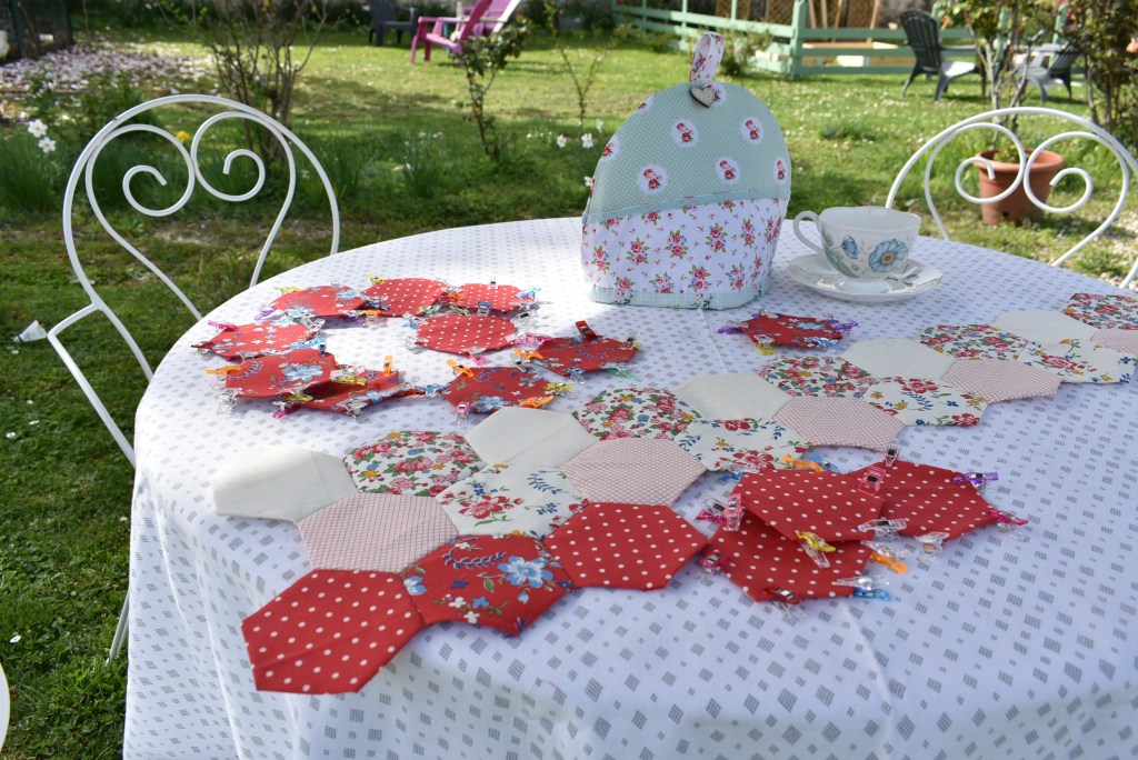 Prenez une pause, un petit goûter et un bon thé bien au chaud sous un couvre théière fraichement cousu, un peu de English Paper piecing pour une dose bien fleurie et enfin, un fondant au chocolat et sa boule de glace à la vanille.