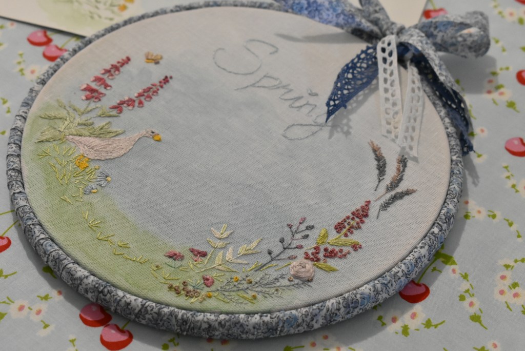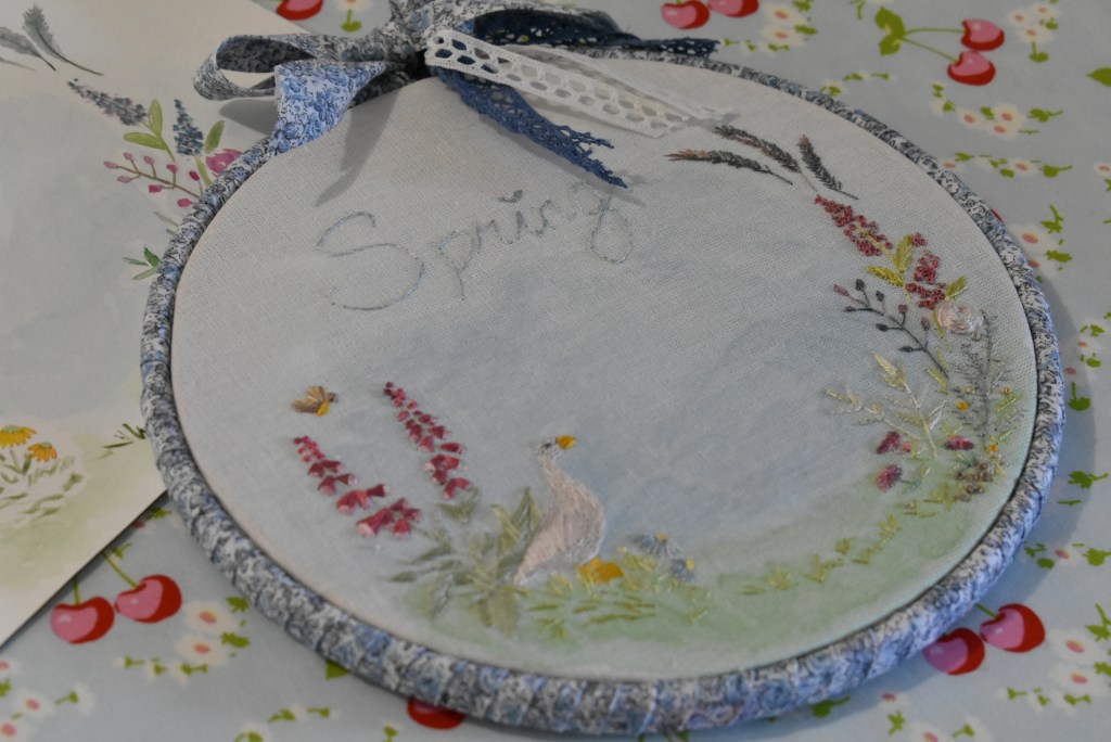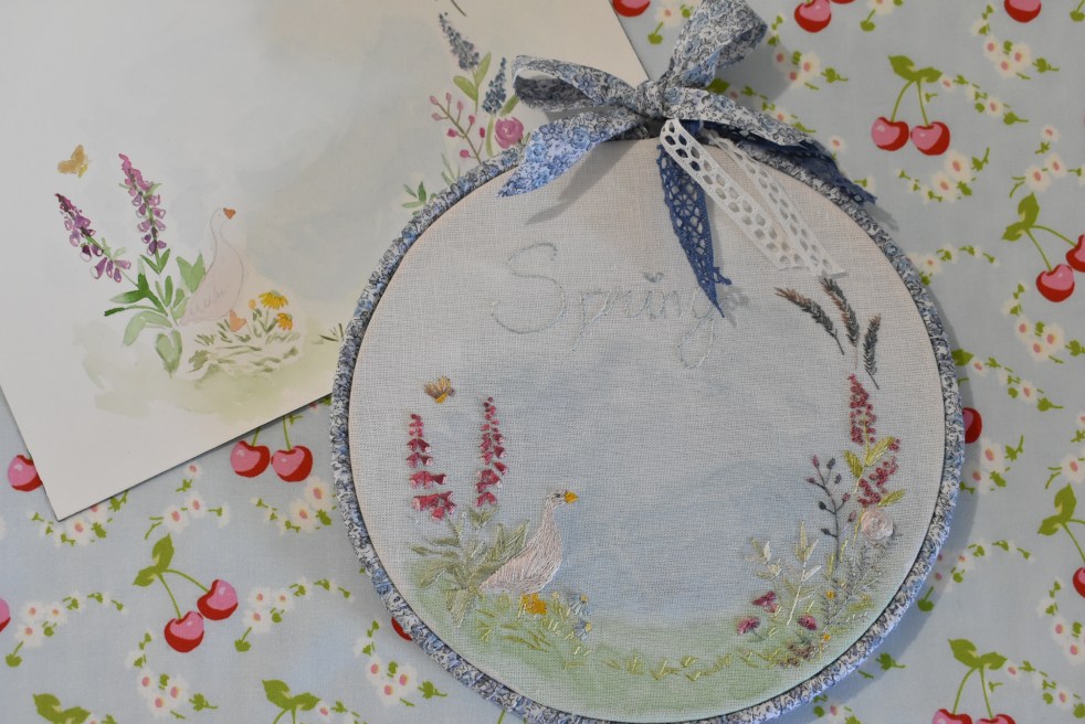 Je vous emmène aujourd’hui dans un coin de mon imagination, une balade en compagnie d’une oie et au milieu des fleurs. Un petit vent de Printemps souffle sur la broderie, laissant s’envoler quelques plumes et quelques rubans.