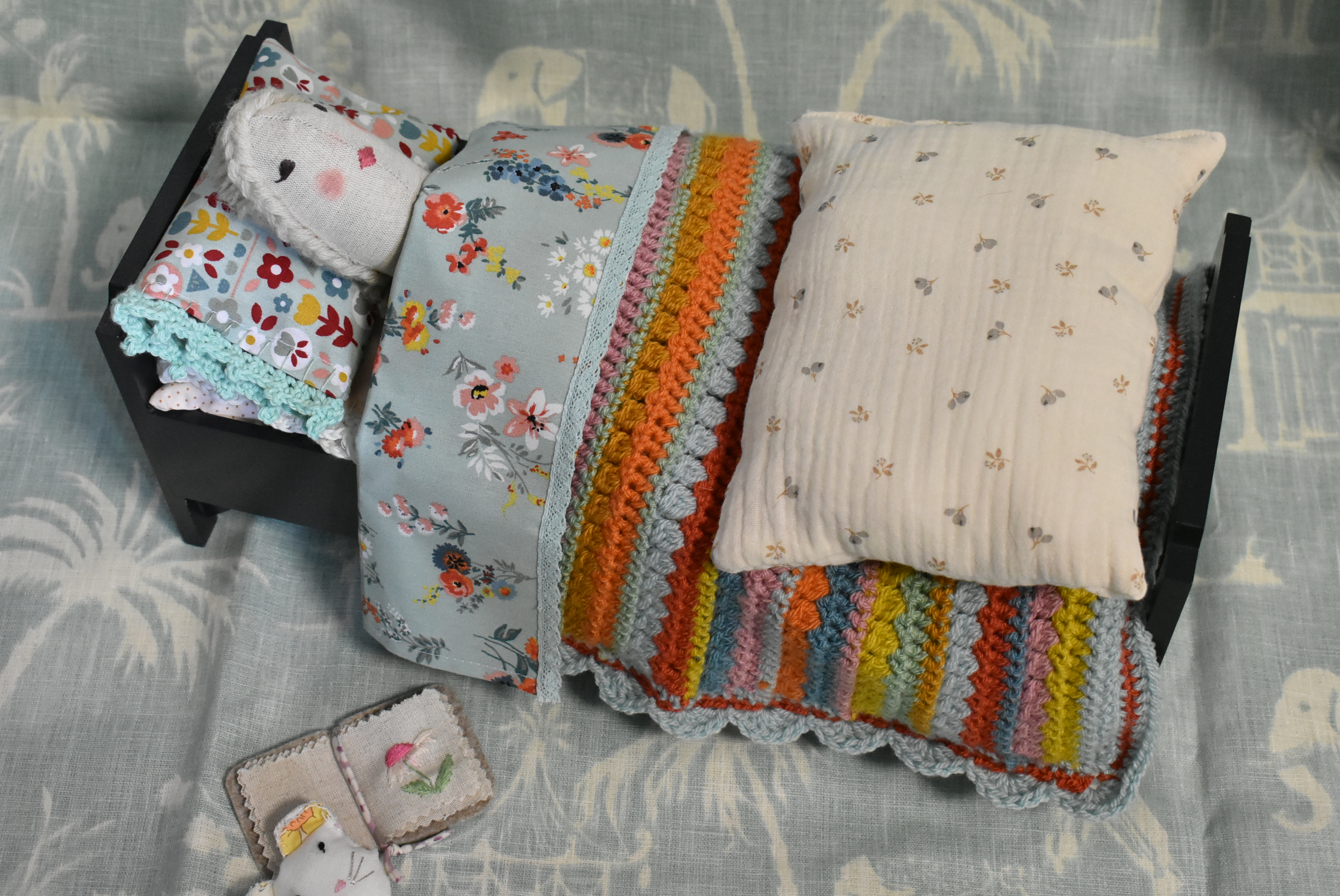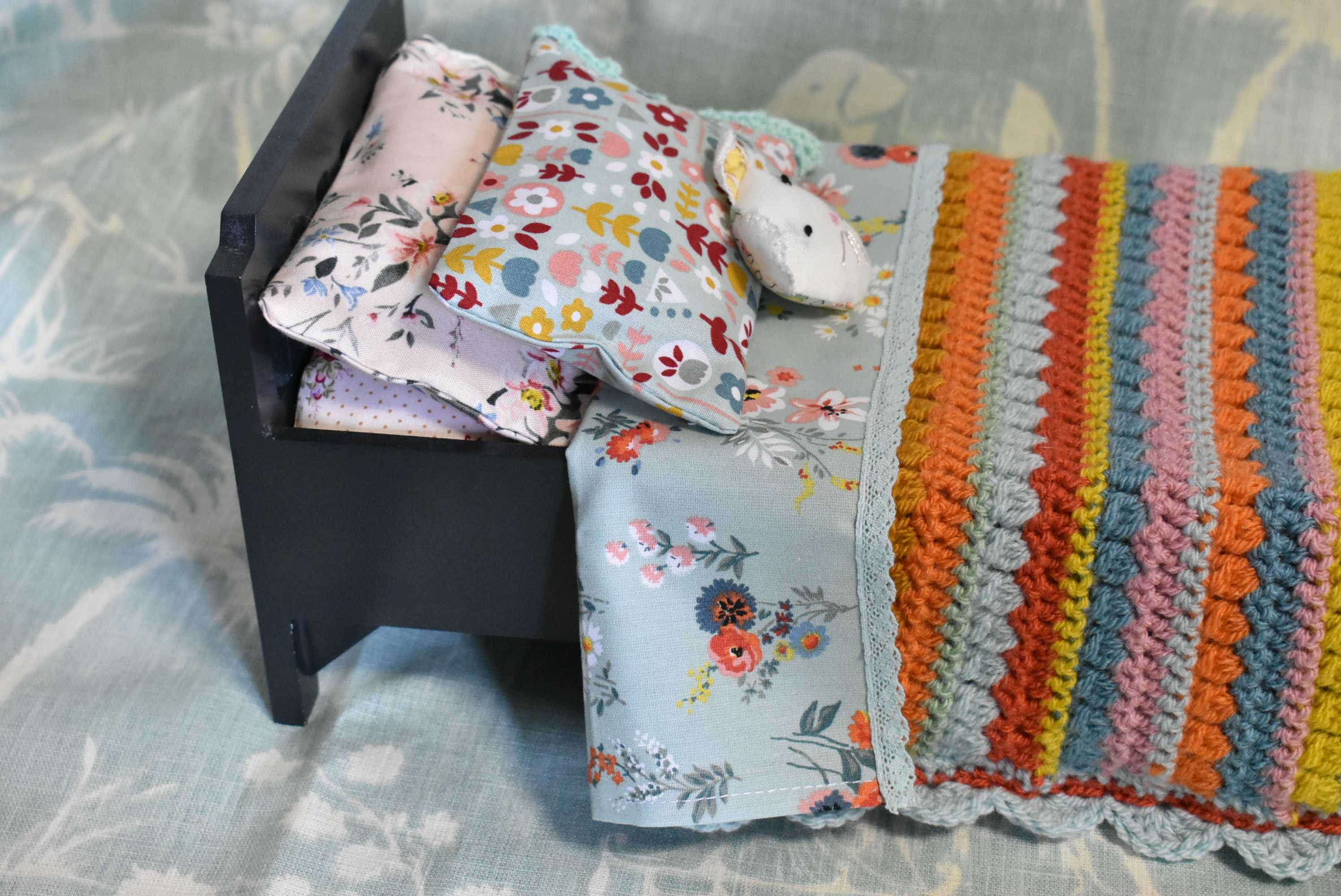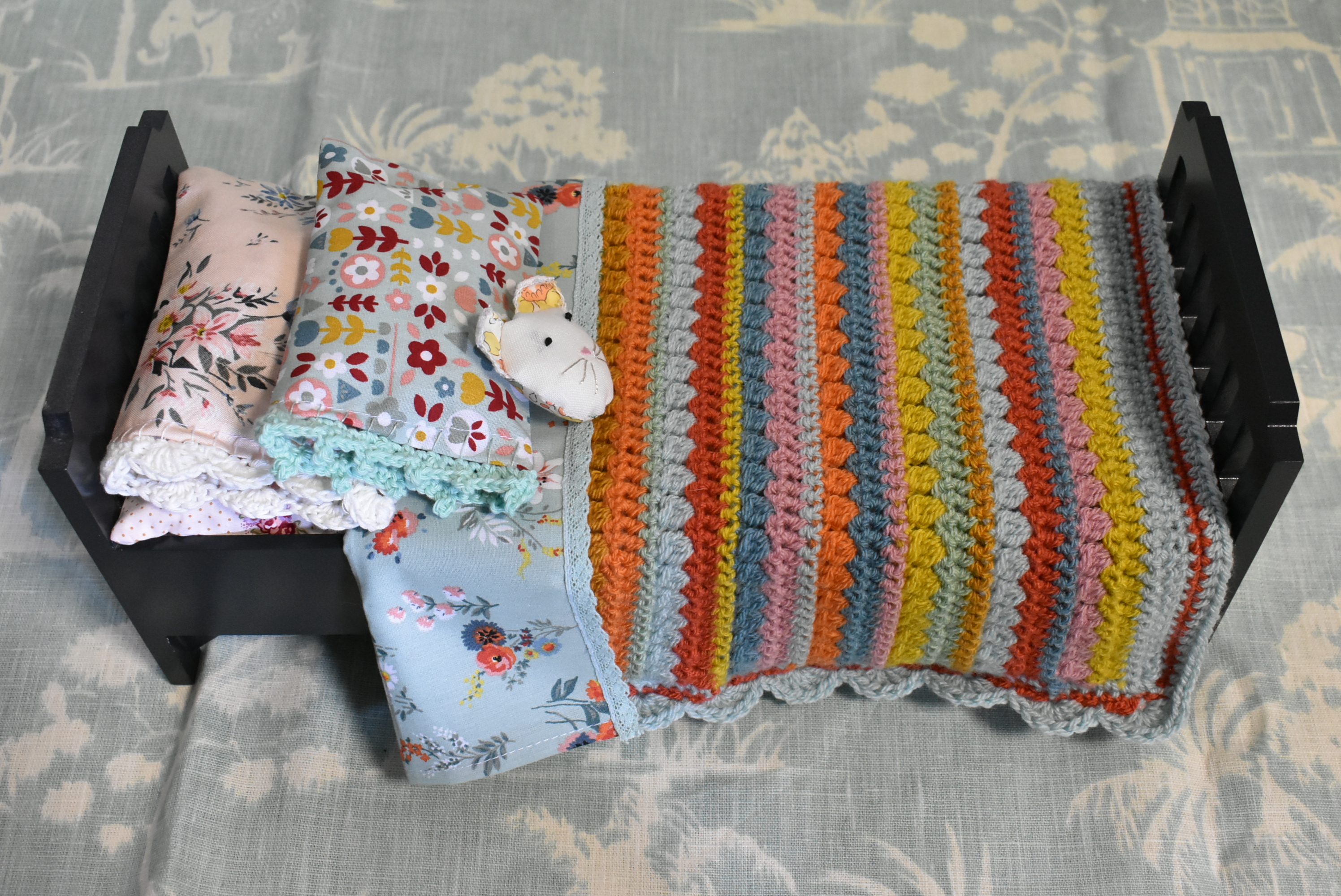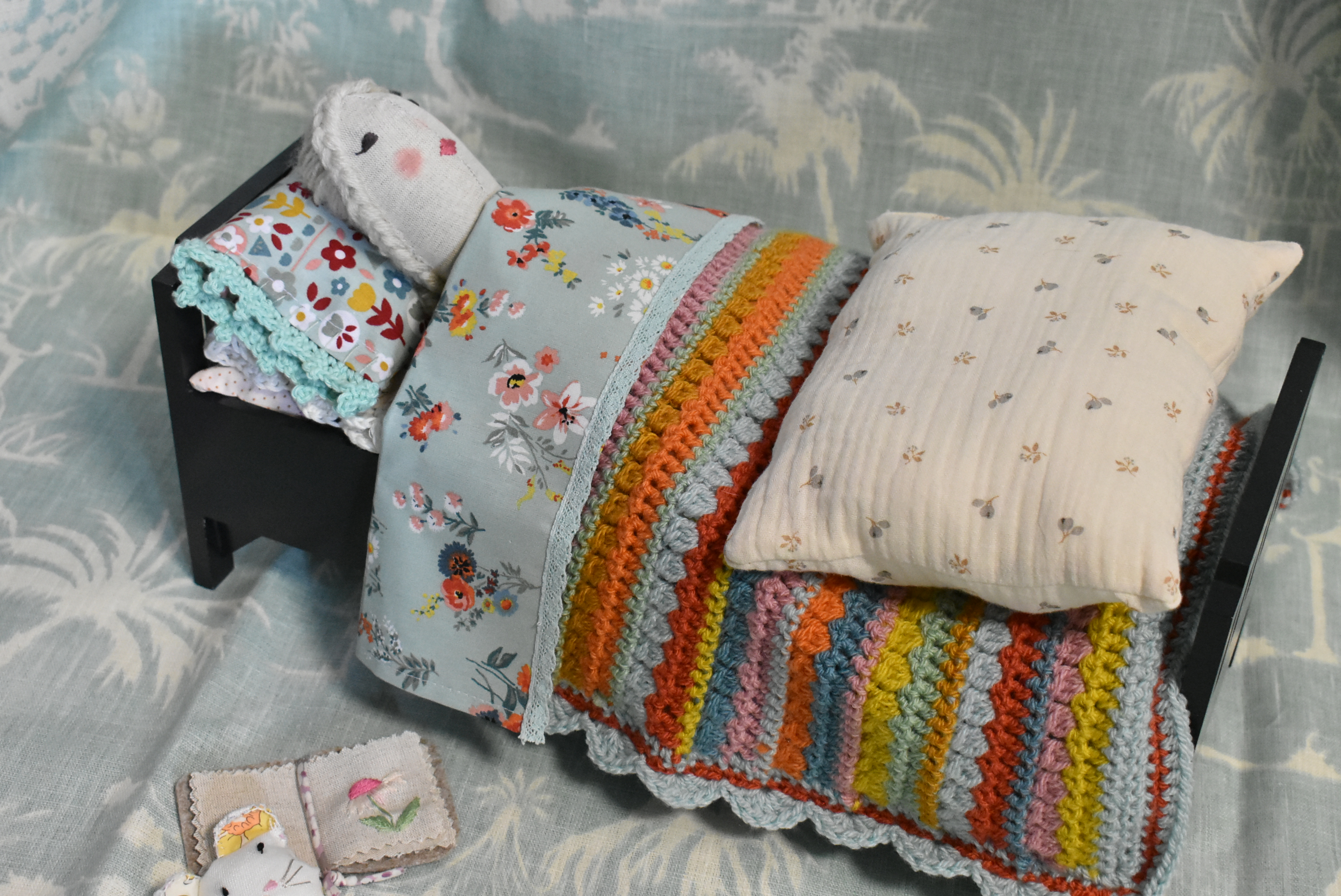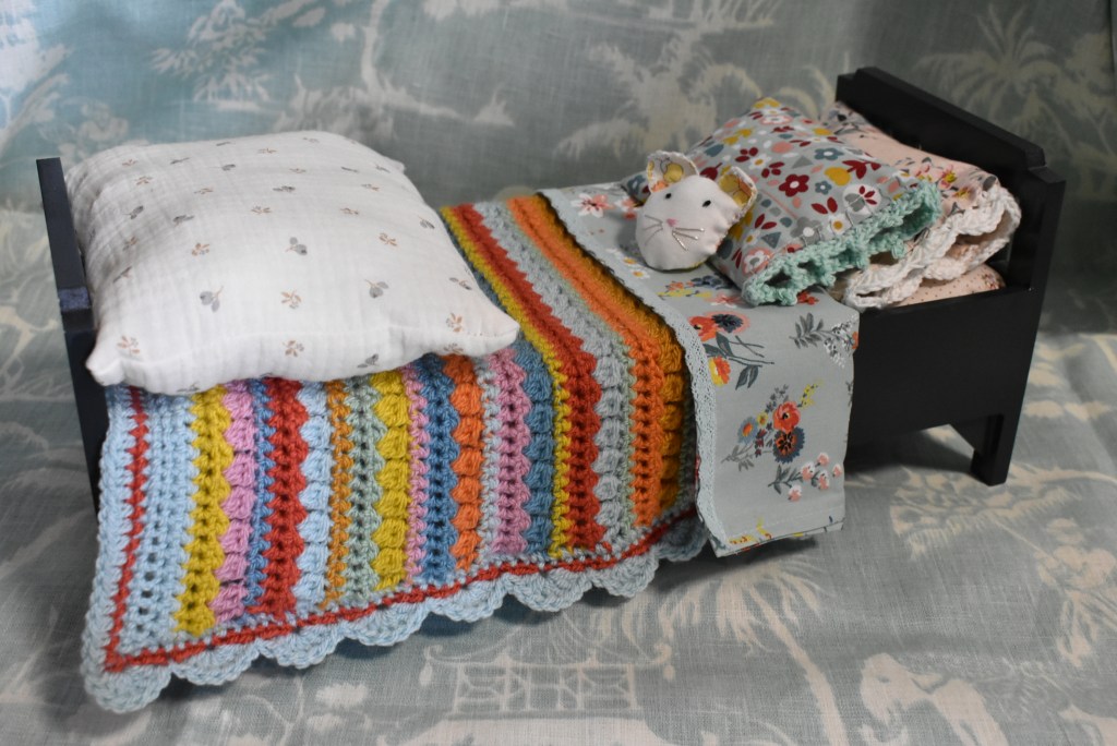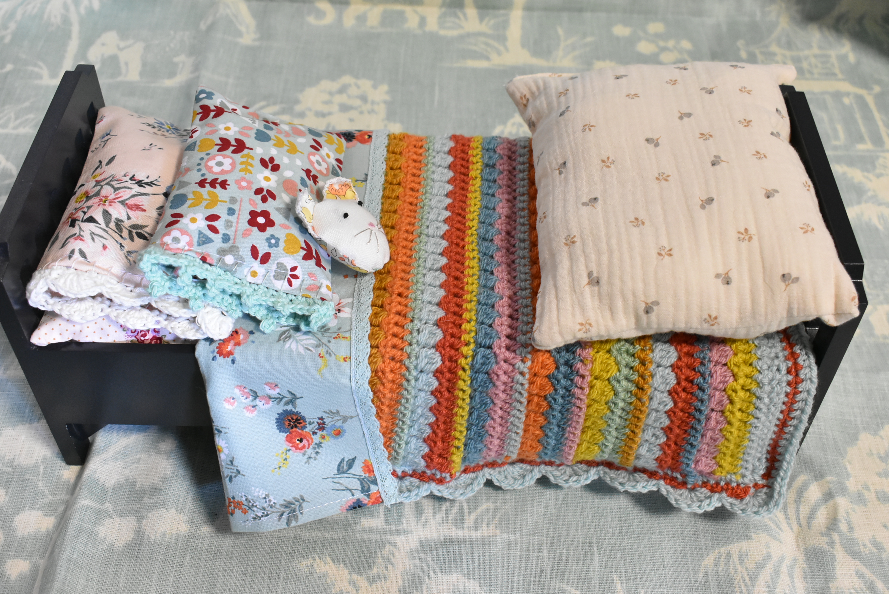 *Pour la taille du lit: 39 cm x 16 cm, j’ai choisi de faire un draps bien large : 37 cm x 35 cm (mais comptez 50 cm de la tête au pied pour pouvoir faire un replis et poser une bordure en crochet), et de même pour la couverture 28 cm x 35 cm.