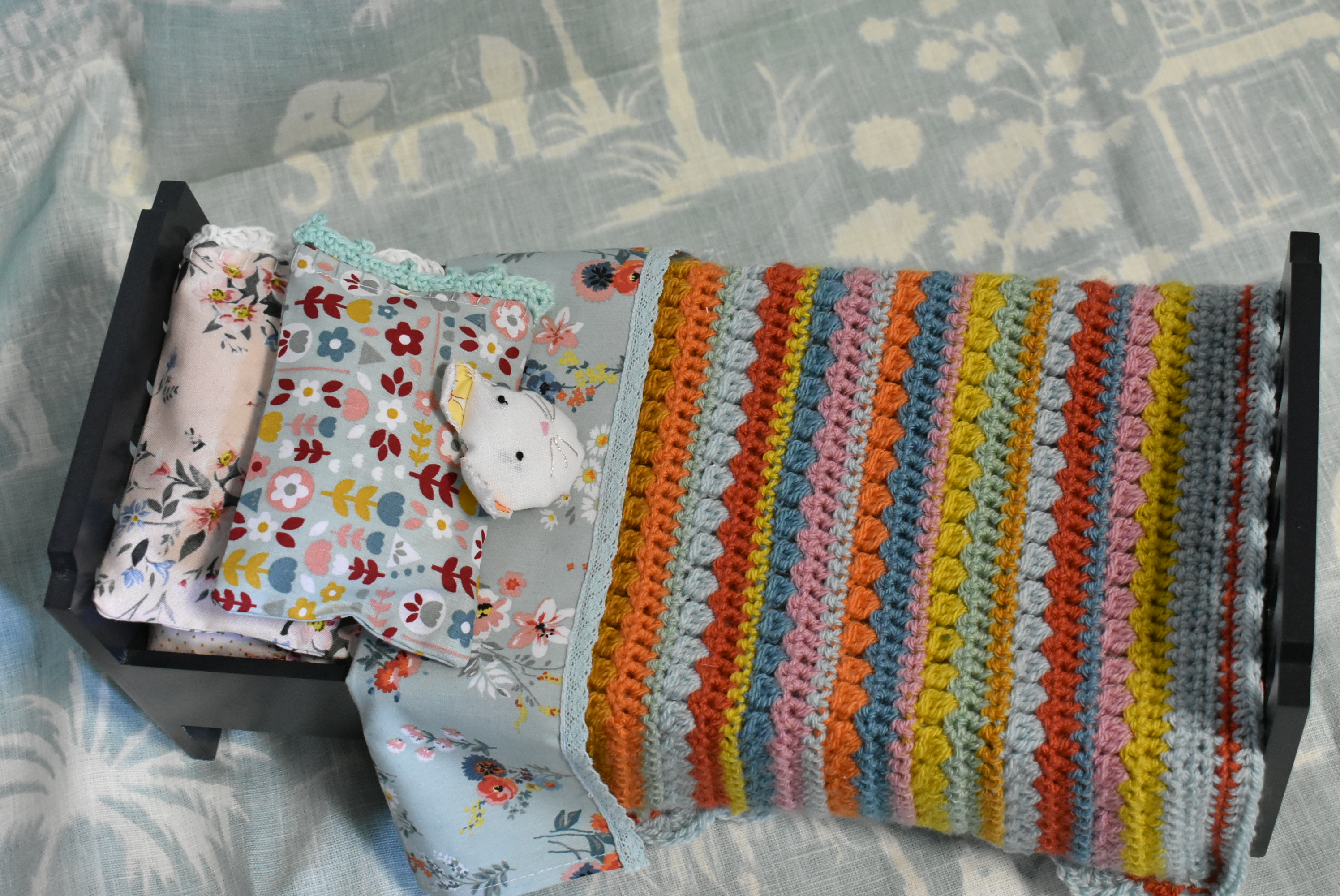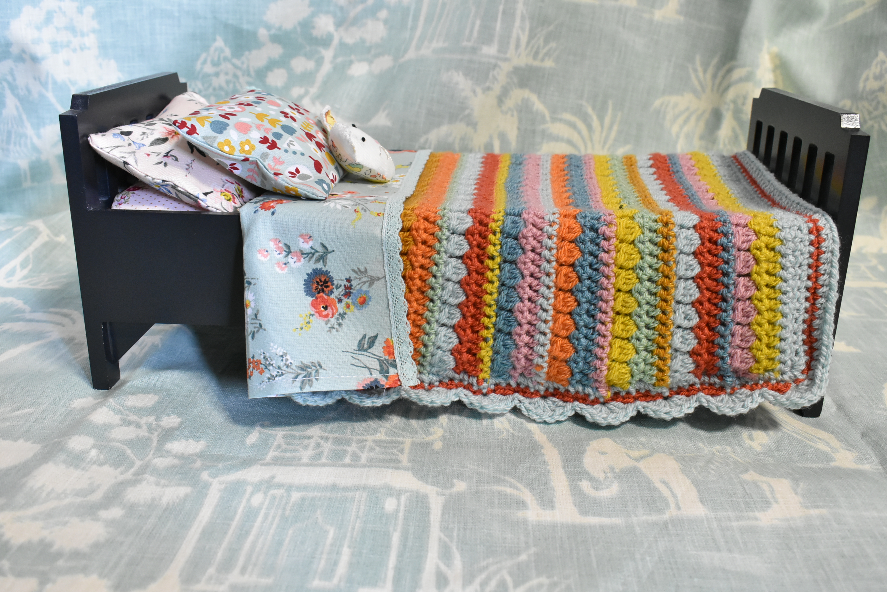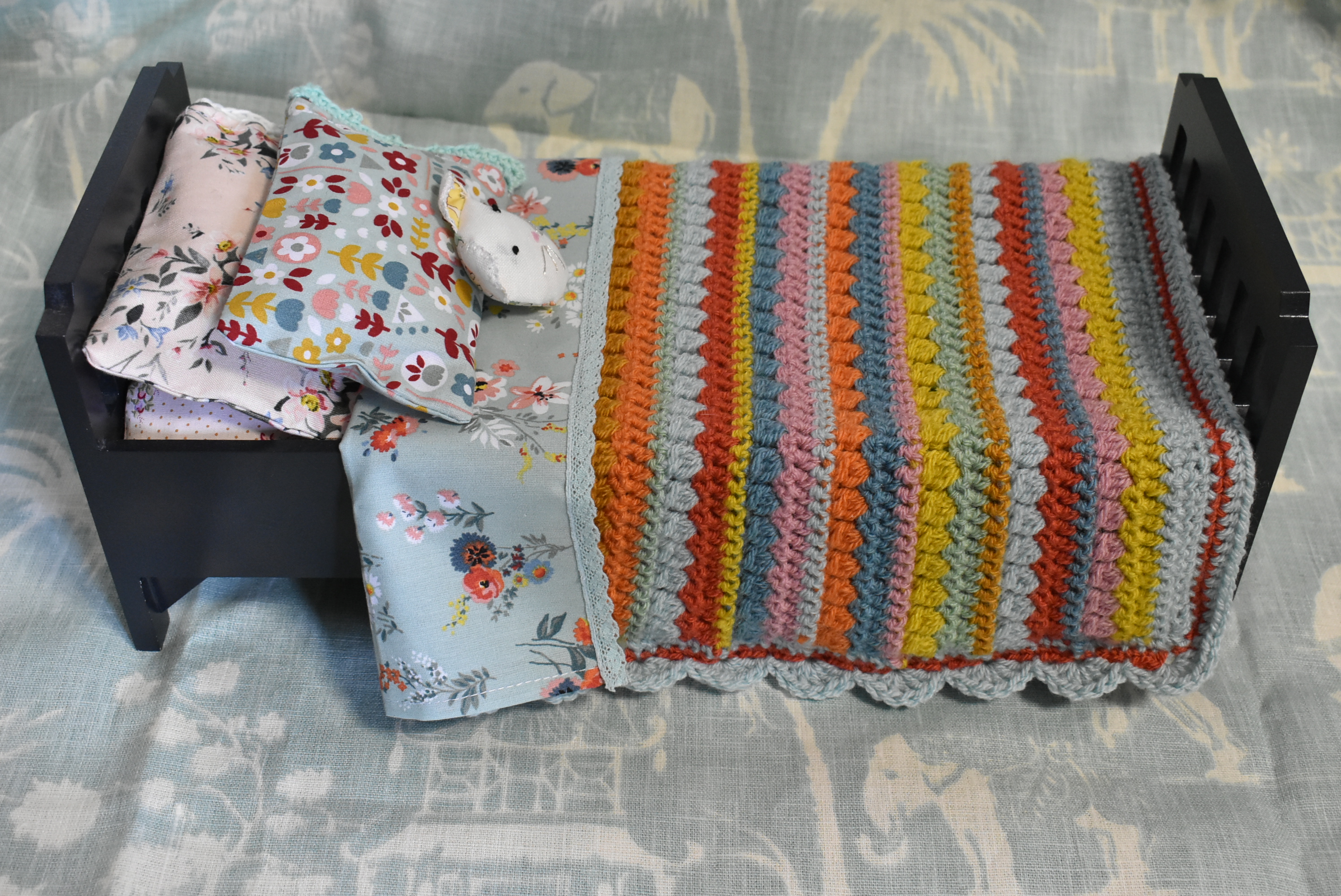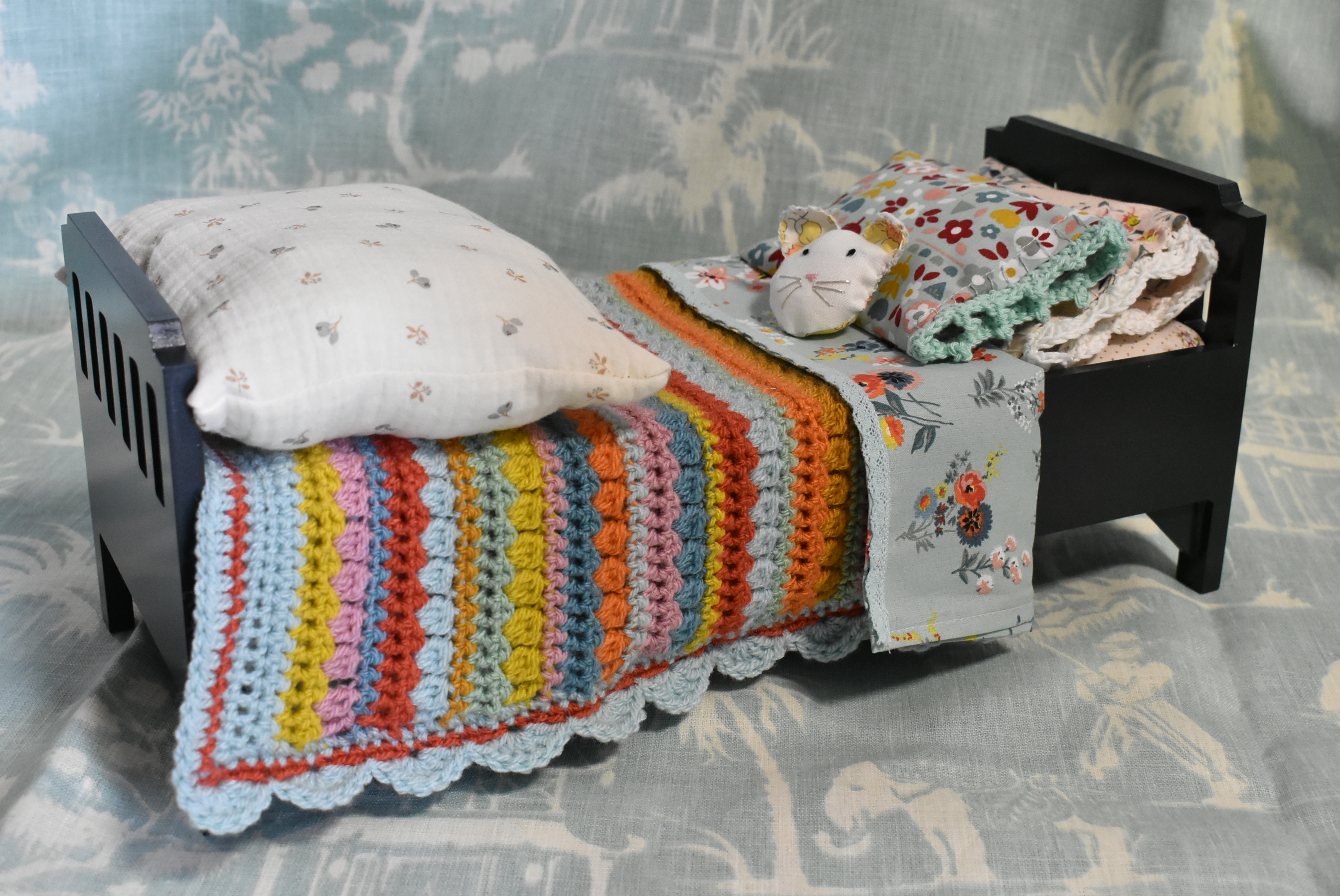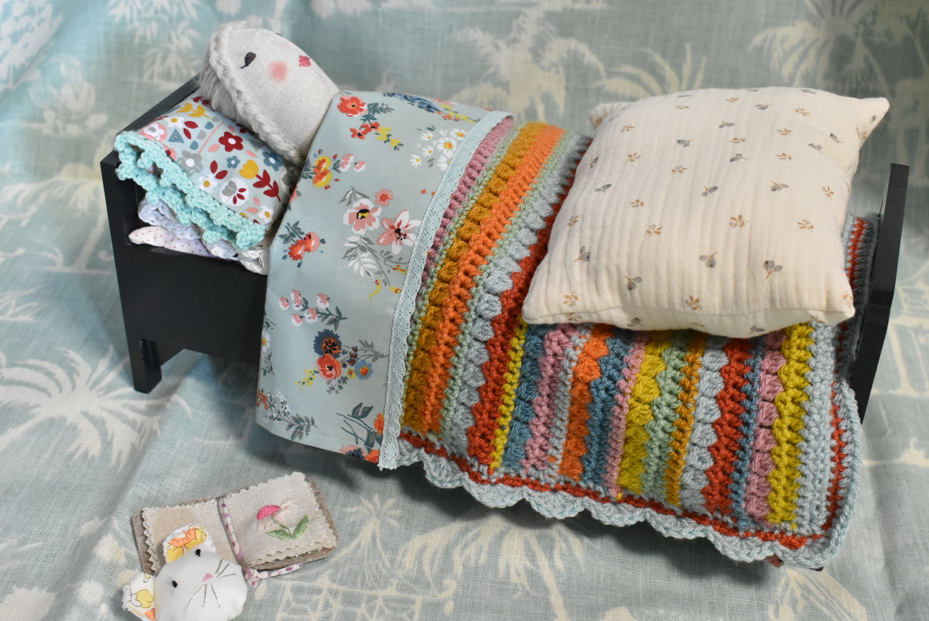 *Pour la taille du lit: 39 cm x 16 cm, j’ai choisi de faire un draps bien large : 37 cm x 35 cm (mais comptez 50 cm de la tête au pied pour pouvoir faire un replis et poser une bordure en crochet), et de même pour la couverture 28 cm x 35 cm.