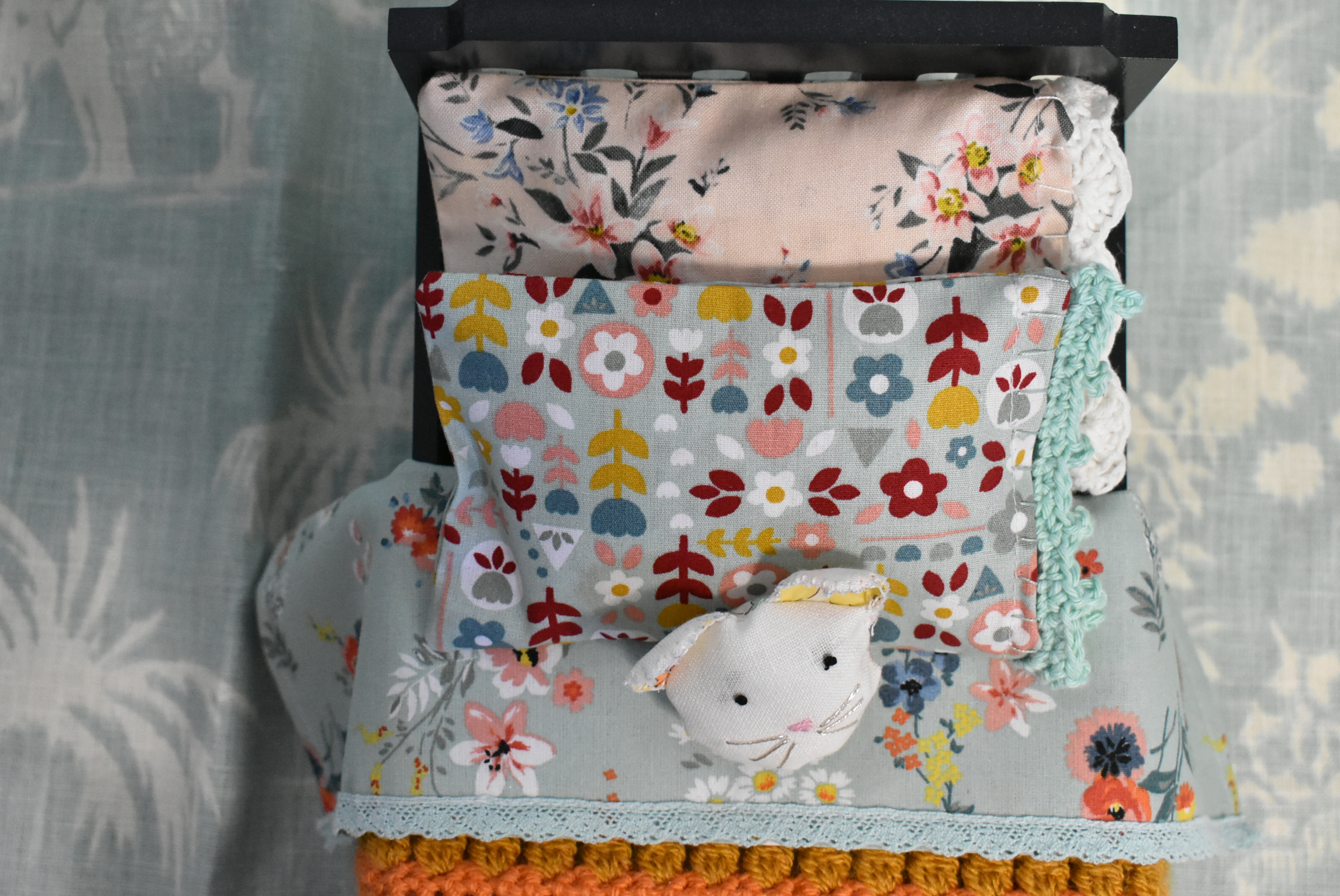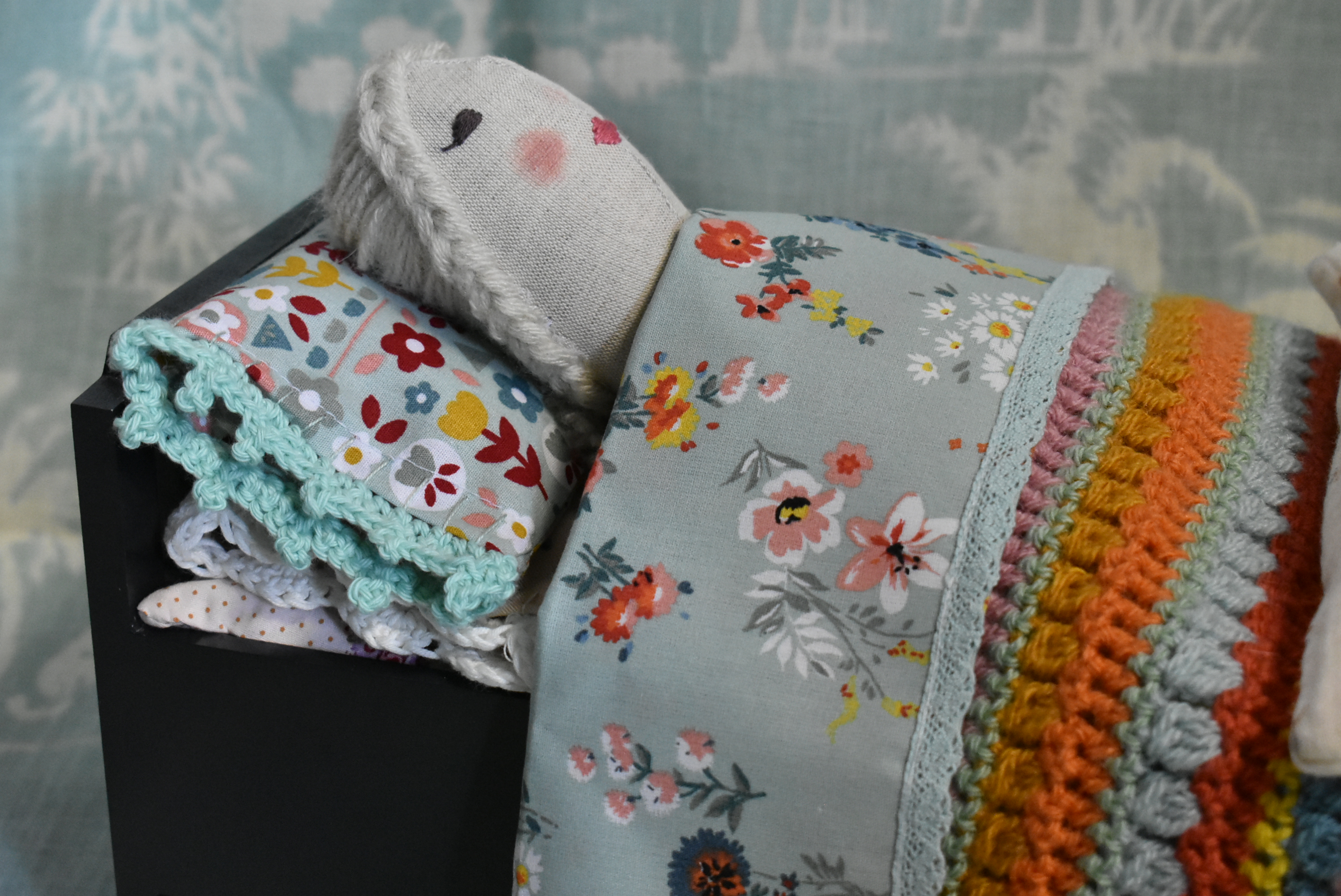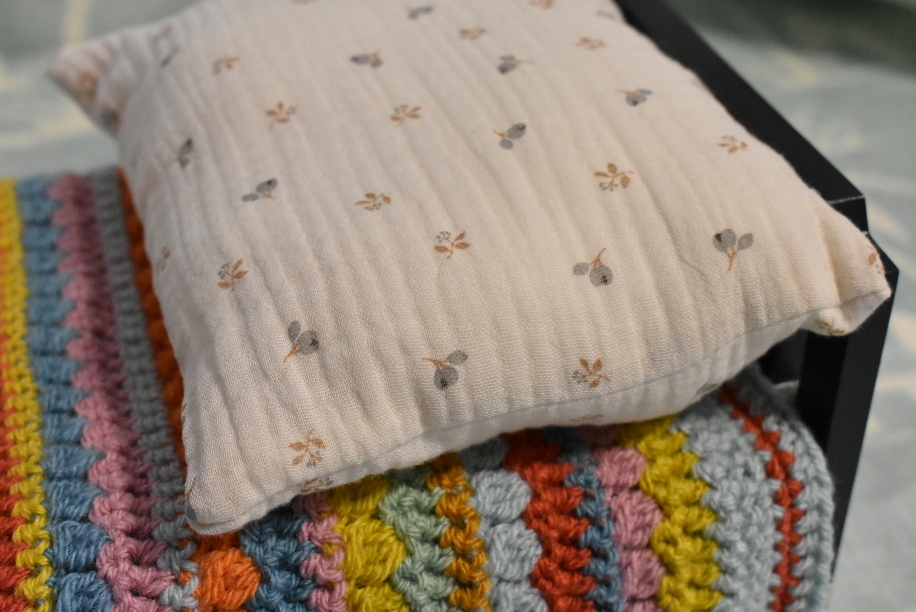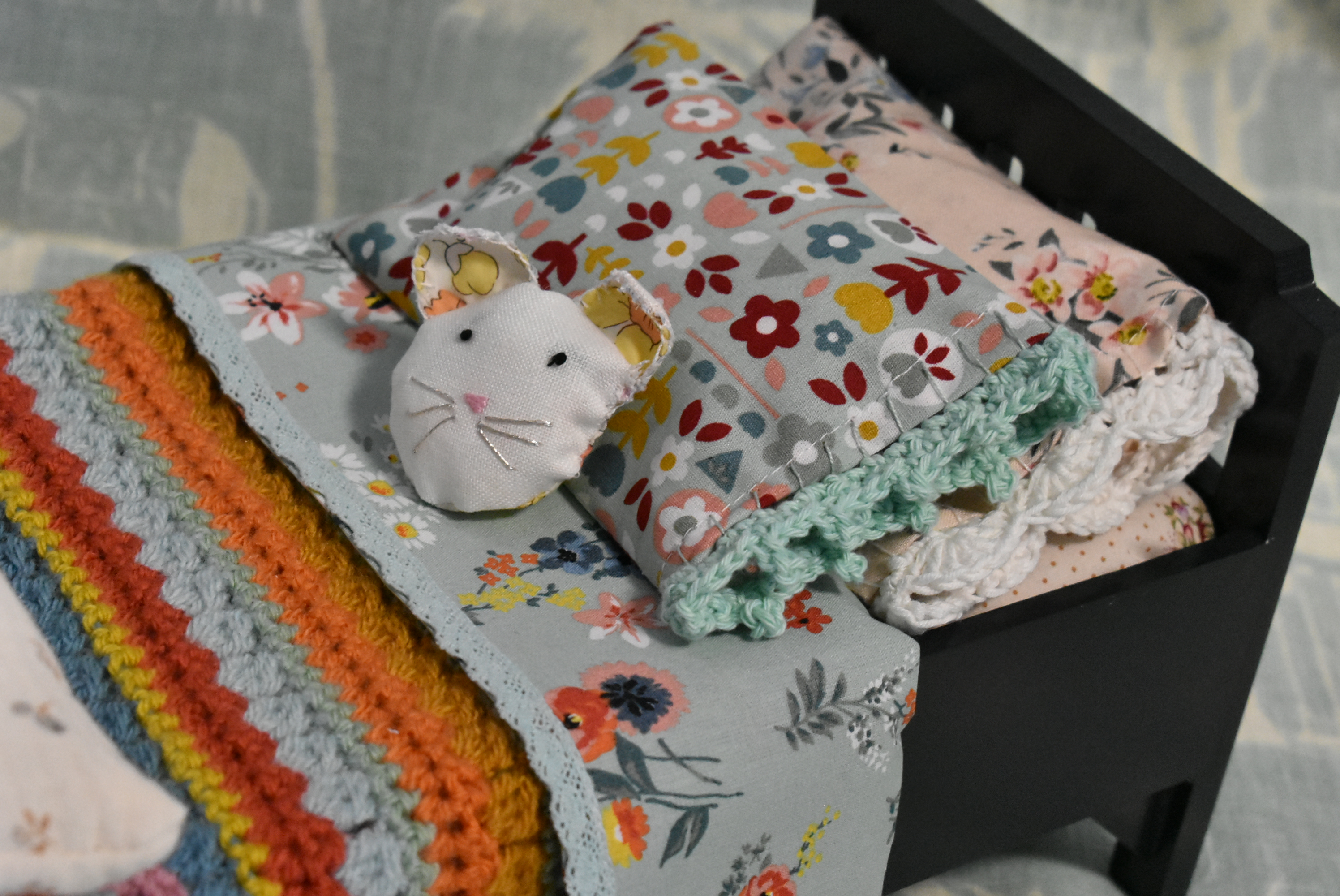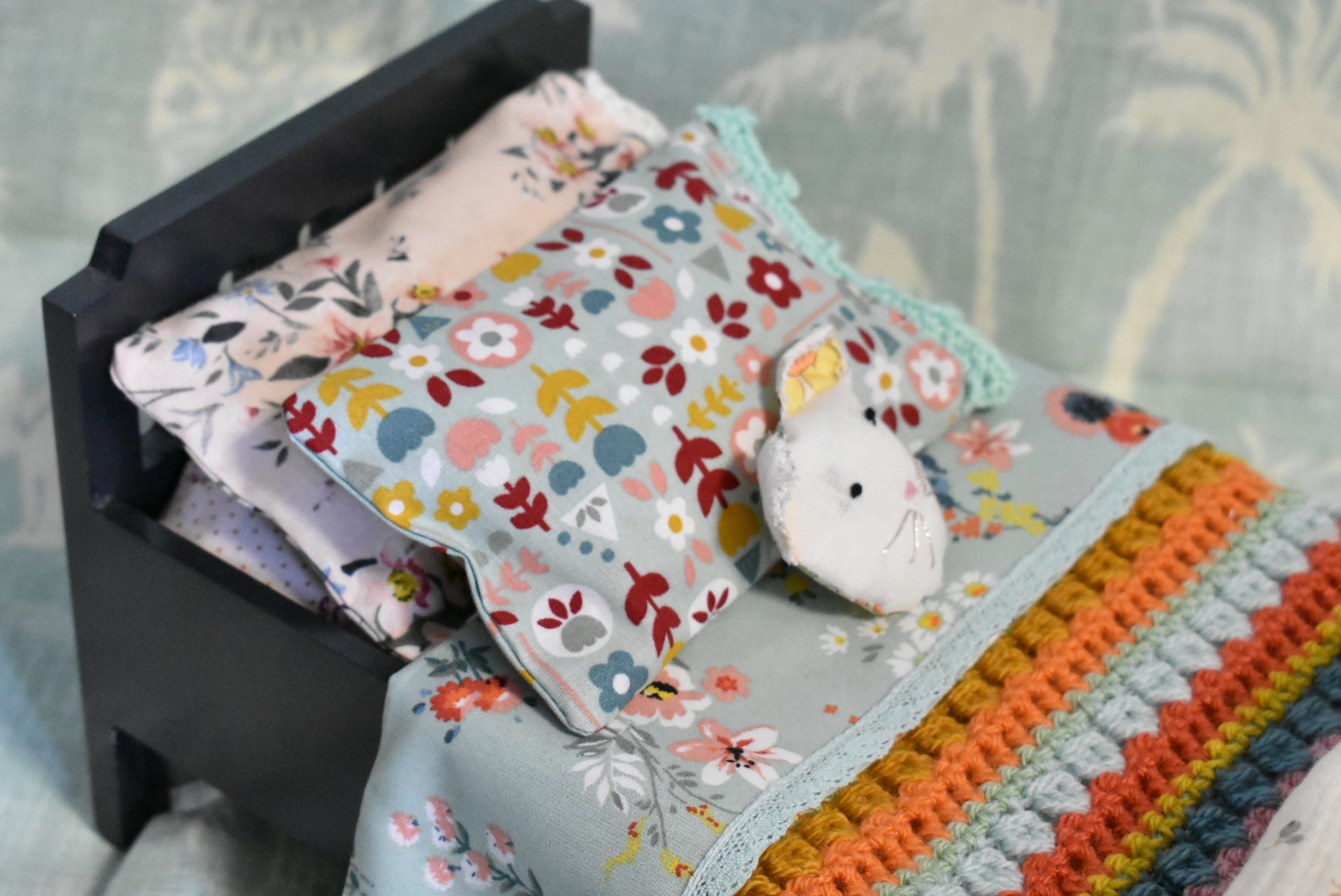*Pour la taille du lit: 39 cm x 16 cm, j’ai choisi de faire un draps bien large : 37 cm x 35 cm (mais comptez 50 cm de la tête au pied pour pouvoir faire un replis et poser une bordure en crochet), et de même pour la couverture 28 cm x 35 cm.