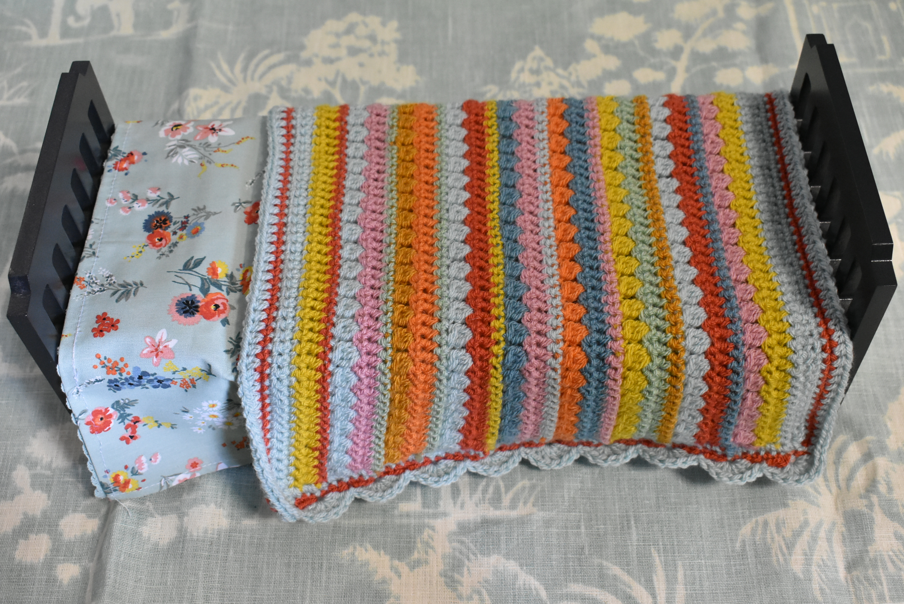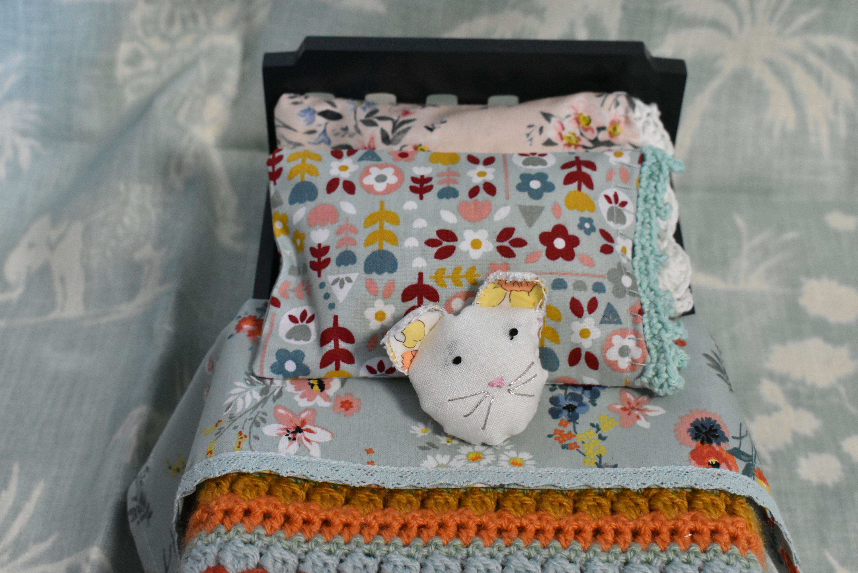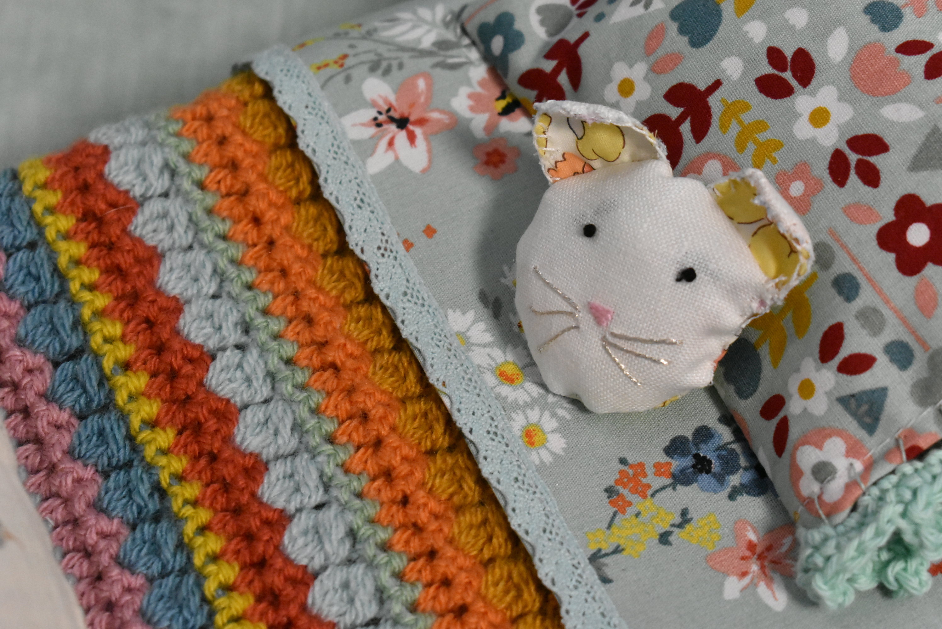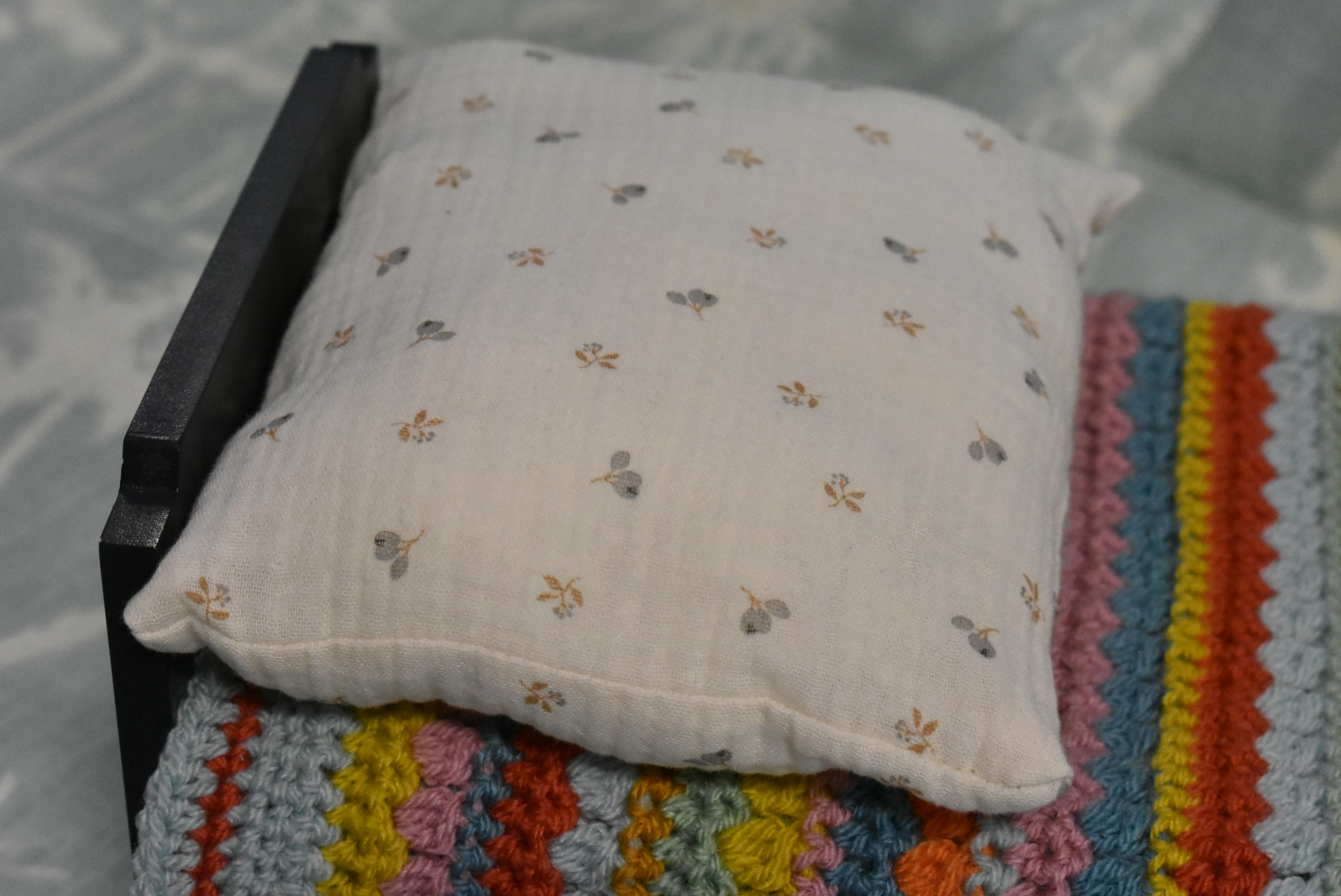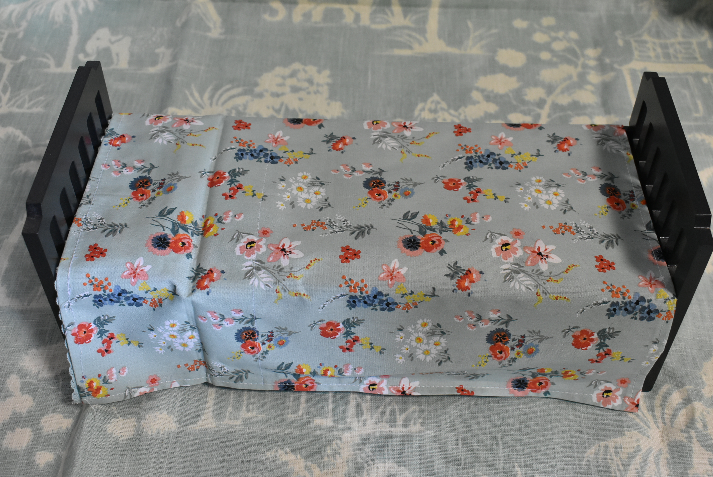 *Pour la taille du lit: 39 cm x 16 cm, j’ai choisi de faire un draps bien large : 37 cm x 35 cm (mais comptez 50 cm de la tête au pied pour pouvoir faire un replis et poser une bordure en crochet), et de même pour la couverture 28 cm x 35 cm.