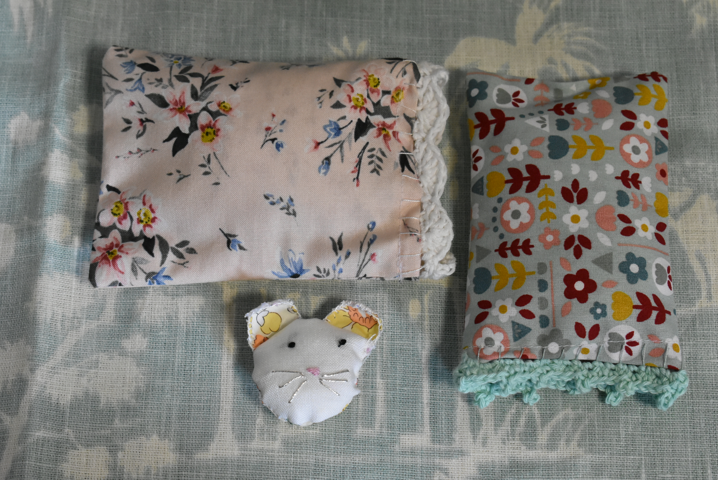 *Des taies d’oreillers avec une bordure crochetée à la main: 9 cm x 14 cm finie (comptez le double et 1 cm de marge pour faire les coutures), une simple pochette pour y glisser des oreillers fait maison, un peu de tissu, un peu de ouate de rembourrage et c’est parti!!