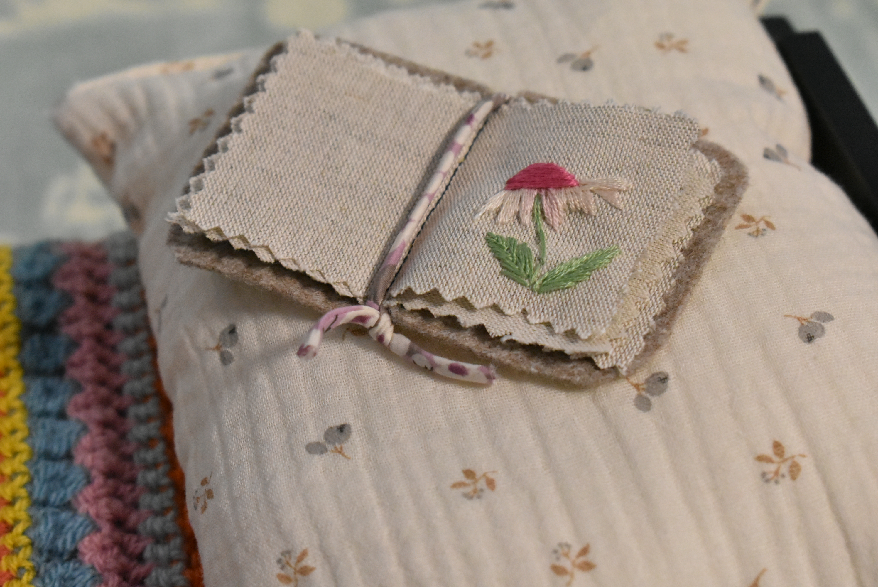 Ce projet me tient particulièrement à cœur car j’ai allié les choses que j’aime beaucoup: Le Lin, la broderie, le tissus imprimé, et surtout un cahier (les pages….oh que j’aime lire ou écrire!! toucher les pages et tenir un journal!!)