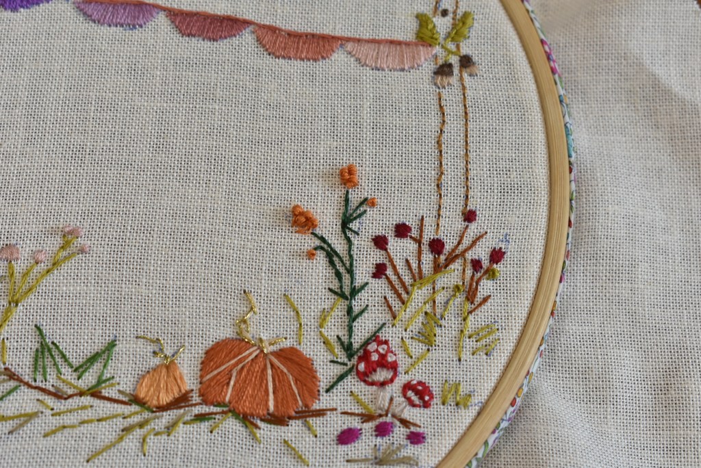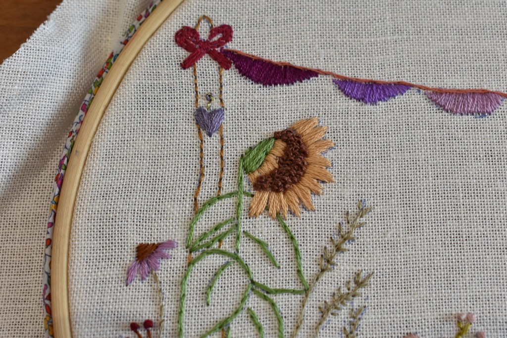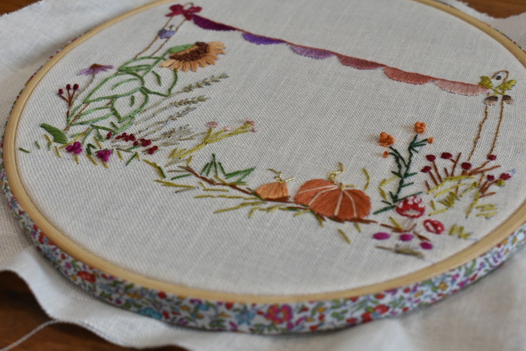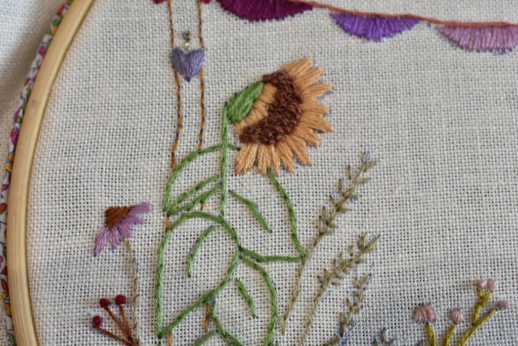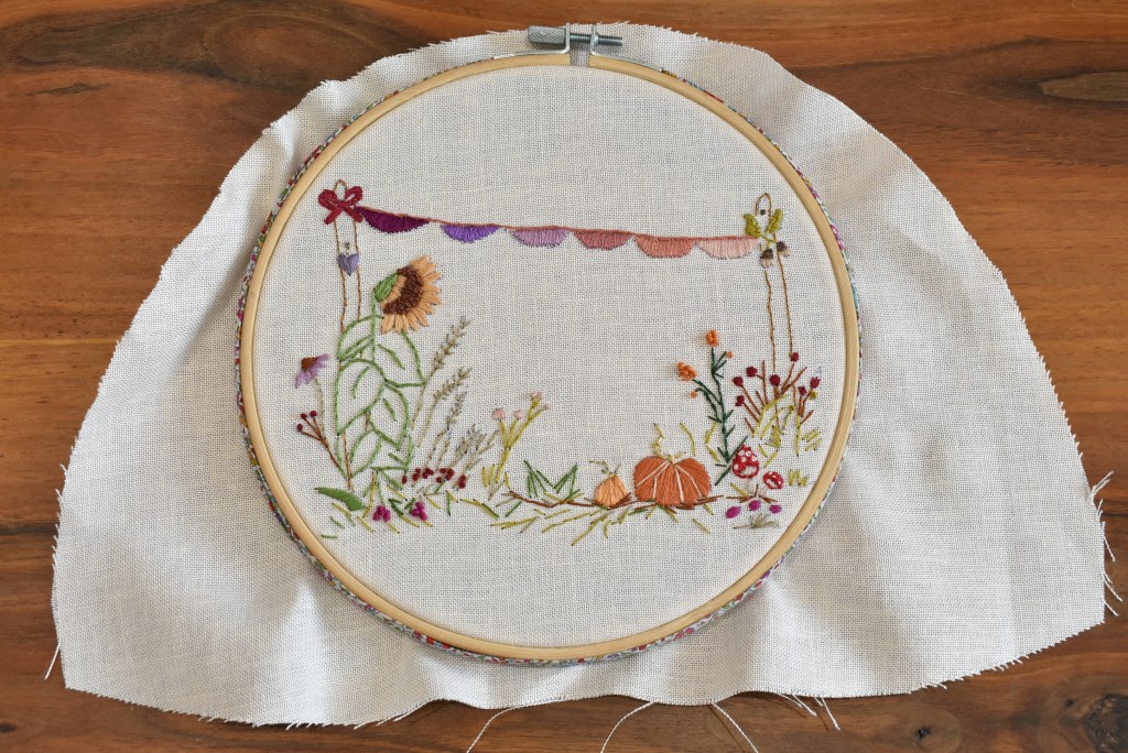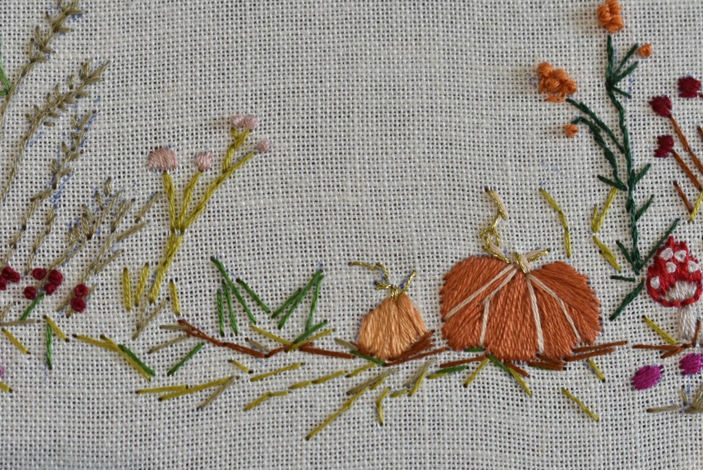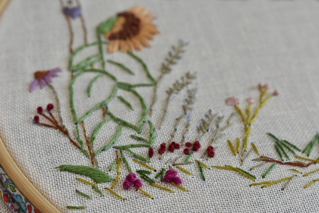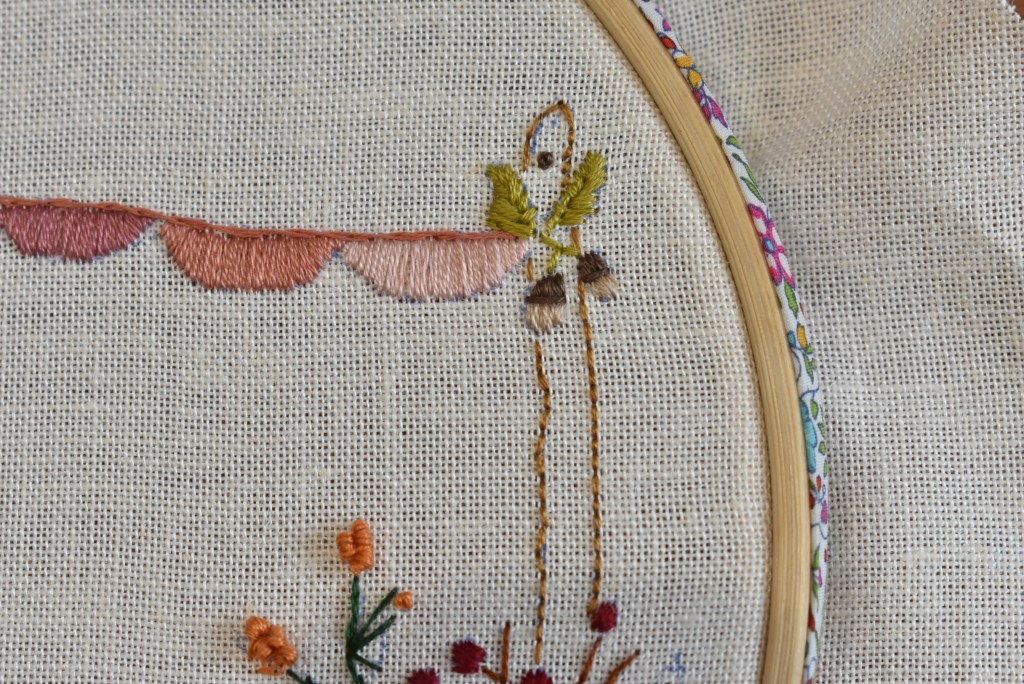 Un herbier brodé sur une toile de lin qui reste un peu chiffonnée comme si elle sortait du milieu de pages d’un livre botanique ancien.